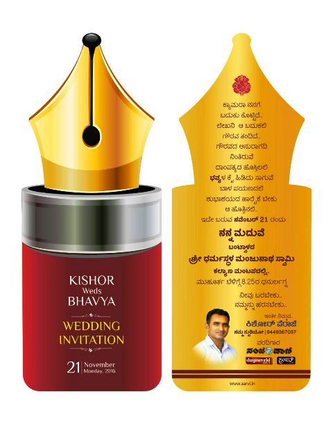 ಬಿ.ಸಿ.ರೋಡಿನ ಯುವ ಛಾಯಾಗ್ರಾಹಕ, ಪತ್ರಕರ್ತ ಕಿಶೋರ್ ಪೇರಾಜೆಯವರ ಲೇಖನಿ ಮಾದರಿಯ ವಿವಾಹ ಆಮಂತ್ರಣ ಅತ್ಯಾಕರ್ಷವಾಗಿ ಮೂಡಿ ಬಂದಿದೆ.