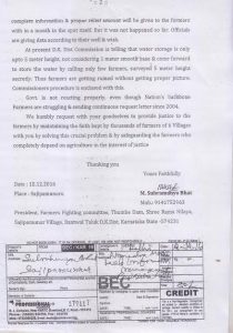 ನಗರಾಭಿವೃದ್ಧಿ ಸಚಿವ, ಉಸ್ತುವಾರಿ ಚಿವ, ಜಿಪಂ ಅಧ್ಯಕ್ಷ, ಮೇಯರ್, ಜಿಲ್ಲಾಧಿಕಾರಿಗಳೆಲ್ಲರ ಉಪಸ್ಥಿತಿಯಲ್ಲಿ ಬಂಟ್ವಾಳ ತಾಲೂಕು ಪಂಚಾಯಿತಿ ಸಭಾಂಗಣದಲ್ಲಿ ಸಂತ್ರಸ್ತ ರೈತರಿಗೆ ನೀಡಿದ ಭರವಸೆಯಂತೆ ಡ್ಯಾಂನಲ್ಲಿ 4 ಮೀಟರ್ ಮಾತ್ರ ನೀರು ಸಂಗ್ರಹಿಸಲಾಗುವುದು, ಇಲ್ಲವಾದಲ್ಲಿ ಸೂಕ್ತ ಪರಿಹಾರ ಬಳಿಕ ನೀರು ತುಂಬಿಸಲಾಗುವುದು ಎಂಬುದು ಸುಳ್ಳಾಗಿದೆ. ರೈತರಿಗೆ ಚಿಕ್ಕಾಸೂ ಪರಿಹಾರ ಕೊಡದೆ, ಡ್ಯಾಂನಲ್ಲಿ ನೀರು ತುಂಬಿಸಿ ಗಂಗಾ ಪೂಜೆ ಮಾಡಲಾಗಿದೆ. ರೈತರಿಗೆ ನ್ಯಾಯ ಒದಗಿಸುವಂತೆ ಪ್ರಧಾನಿ ನರೇಂದ್ರ ಮೋದಿ ಅವರಿಗೆ ತುಂಬೆ ಡ್ಯಾಂ ಸಂತ್ರಸ್ತ ರೈತರ ಹೋರಾಟ ಸಮಿತಿ ಅಧ್ಯಕ್ಷ ಎಂ.ಸುಬ್ರಹ್ಮಣ್ಯ ಭಟ್ ಅವರು ಲಿಖಿತ ಮನವಿ ಸಲ್ಲಿಸಿದ್ದಾರೆ. 2004ರಲ್ಲಿ ಪರಿಹಾರಕ್ಕೆ 3 ಕೋ.ರೂ ತೆಗೆದಿರಿಸಲಾಗಿದೆ ಎಂದು ಅಂದಿನ ಜಿಲ್ಲಾಧಿಕಾರಿ ತಿಳಿಸಿದ್ದರು. 2016ರಲ್ಲಿ 50 ಕೋ.ರೂ. ಪರಿಹಾರಕ್ಕೆ ಬೇಕಾಗಿದ್ದು ಮುಖ್ಯಮಂತ್ರಿಗೆ ಮನವಿ ಮಾಡಲಾಗಿದೆ ಎಂದು ನಗರಪಾಲಿಕೆ ಮೇಯರ್ ಹೇಳಿದ್ದು, ಜಿಲ್ಲಾಧಿಕಾರಿಗಳ ಸಭೆಯಲ್ಲಿ ನಗರಪಾಲಿಕೆ ಆಯುಕ್ತರು 10 ಕೋ.ರೂ.ಪರಿಹಾರಕ್ಕೆ ವ್ಯವಸ್ಥೆ ಮಾಡಲಾಗಿದೆ ಎಂದು ತಿಳಿಸಿದ್ದರು. ಅದಾದ ಬಳಿಕ ನಡೆದ ಸಭೆಯಲ್ಲಿ ಜಿಲ್ಲಾಧಿಕಾರಿಗಳ ಆದೇಶದಂತೆ ಡ್ಯಾಂನಲ್ಲಿ ನೀರು ಸಂಗ್ರಹಿಸುವಾಗ ವೈಜ್ಞಾನಿಕವಾಗಿ ಶಿಪಾರಸ್ಸುಗೊಂಡಂತೆ 1 ಮೀ.ಎತ್ತರಕ್ಕೆ ಹೆಚ್ಚುವರಿಯಾಗಿ ವರತೆ ಪ್ರದೇಶ ಮುಳುಗಡೆ ಸರ್ವೆ ನಡೆಸಿ ಸೂಕ್ತ ಪರಿಹಾರ ನೀಡಲಾಗುವುದು ಎಂದಿದ್ದರು ಎಂದು ಪತ್ರದಲ್ಲಿ ಉಲ್ಲೇಖಿಸಲಾಗಿದೆ.