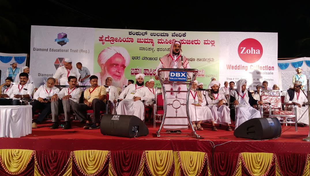 ಮಾರಿಪಳ್ಳ ಸುಜೀರು ಮಲ್ಲಿ ಹೈದ್ರೋಸಿಯಾ ಜುಮಾ ಮಸೀದಿಯ ಆಶ್ರಯದಲ್ಲಿ ದಫನ ಭೂಮಿ ಖರೀದಿಯ ಸಹಾಯಾರ್ಥವಾಗಿ ಇಲ್ಲಿನ ಶಂಸುಲ್ ಉಲಮಾ ವೇದಿಕೆಯಲ್ಲಿ ಶುಕ್ರವಾರ ರಾತ್ರಿ ನಡೆದ ಬೃಹತ್ ಏಕದಿನ ಧಾರ್ಮಿಕ ಮತ ಪ್ರಭಾಷಣದಲ್ಲಿ ಅವರು ಮಾತನಾಡಿದರು.