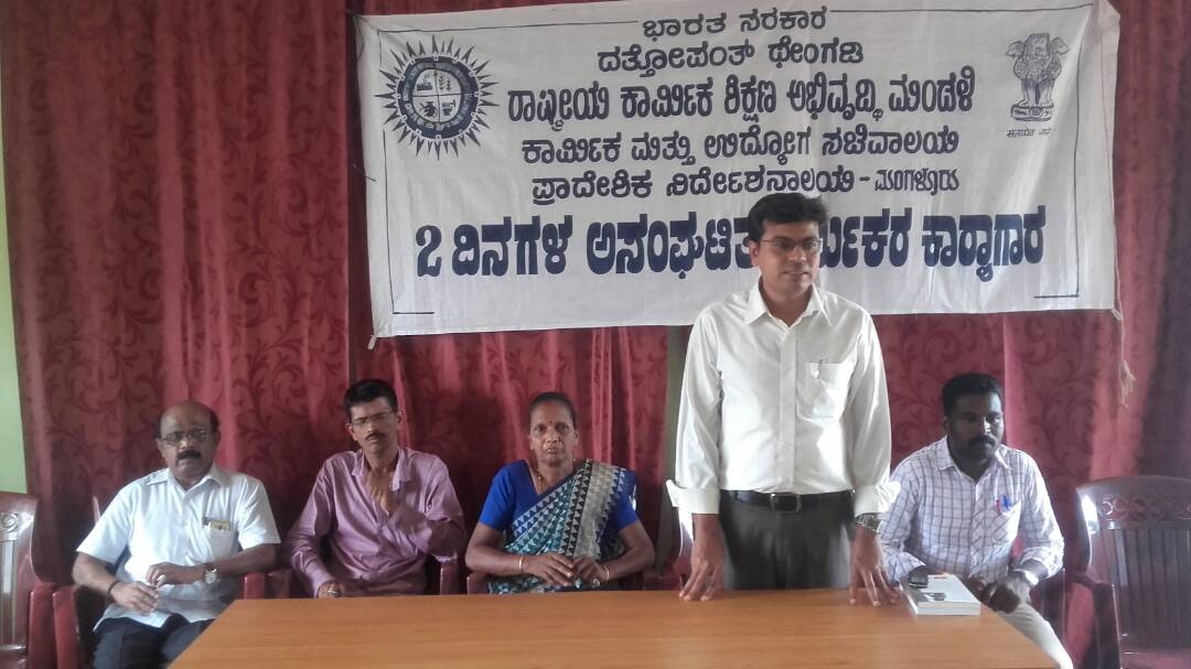 ಭಾರತ ಸರಕಾರದ ದತ್ತೋಪಂತ್ ಥೇಂಗಡಿ ಯೋಜನೆಯಡಿ ರಾಷ್ಟ್ರೀಯ ಕಾರ್ಮಿಕ ಶಿಕ್ಷಣ ಅಭಿವೃದ್ಧಿ ಮಂಡಳಿ ವತಿಯಿಂದ ಸಂಗಬೆಟ್ಟು ಗ್ರಾ.ಪಂ. ಸಭಾಂಗಣದಲ್ಲಿ ನಡೆದ ಅಸಂಘಟಿತ ಕಾರ್ಮಿಕರ ಕಾರ್ಯಾಗಾರವನ್ನು ಉದ್ಘಾಟಿಸಿ ಮಾತನಾಡಿದರು. ಗ್ರಾ.ಪಂ. ಅಧ್ಯಕ್ಷೆ ಗುಲಾಬಿ ಸಭಾಧ್ಯಕ್ಷತೆ ವಹಿಸಿದ್ದರು. ಉಪಾಧ್ಯಕ್ಷ ಸತೀಶ್ ಶುಭ ಹಾರೈಸಿದರು. ಗ್ರಾ.ಪಂ. ಸಹಾಯಕ ಲೆಕ್ಕ ಅಧಿಕಾರಿ ಪುಟ್ಟ ಸ್ವಾಮಿ ಕೆ. ಸ್ವಾಗತಿಸಿ, ಸಿಬ್ಬಂದಿ ಮಹಾಬಲ ವಂದಿಸಿದರು.