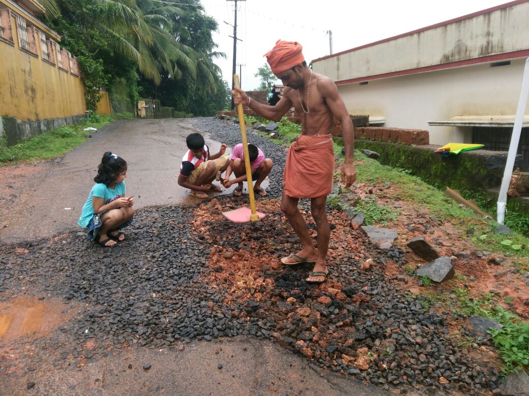 ಕೈಕುಂಜೆ ಪಶ್ಚಿಮ ಬಡಾವಣೆಯಲ್ಲಿ ಸಮಗ್ರ ಕುಡಿಯುವ ನೀರಿನ ಯೋಜನೆಯಿಂದ ಹದಗೆಟ್ಟ ರಸ್ತೆ ಇದು. ಸ್ಥಳೀಯ ಪದ್ಮನಾಭ ಮಕ್ಕಳಿಗೆ ಸಾಥ್ ನೀಡಿ, ಕಲ್ಲು, ಜಲ್ಲಿ ತುಂಬುವ ಮೂಲಕ ದುರಸ್ತಿಗೊಳಿಸಲು ಸಹಕರಿಸಿದರು.