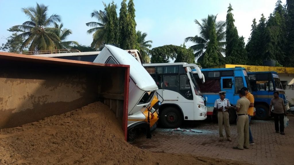 ಬಿ.ಸಿ.ರೋಡಿನ ಹೃದಯಭಾಗದಲ್ಲಿರುವ ಪೆಟ್ರೋಲ್ ಪಂಪ್ ನಲ್ಲಿ ನಿಂತಿದ್ದ ನಾಲ್ಕು ಬಸ್ಸುಗಳಿಗೆ ಭಾನುವಾರ ಬೆಳಗ್ಗೆ ಸುಮಾರು 5.45ರ ಬಳಿಕ ವೇಗವಾಗಿ ಬರುತ್ತಿದ್ದ ಮರಳು ಸಾಗಾಟದ ಟಿಪ್ಪರ್ ಡಿಕ್ಕಿ ಹೊಡೆದು ಆತಂಕಕ್ಕೆ ಕಾರಣವಾಯಿತು.