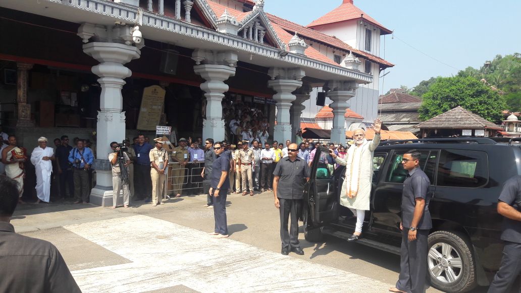 ಜುಬ್ಬಾ, ಪೈಜಾಮವನ್ನು ಧರಿಸಿದ್ದ ಮೋದಿ ಅವರನ್ನು ಕಾರಿನಲ್ಲಿ ಹೆಲಿಪ್ಯಾಡ್ ನಿಂದ ಮಂಜುನಾಥನ ಸನ್ನಿಧಿಗೆ ಕರೆತರಲಾಯಿತು. ಕಾರಿನಿಂದಿಳಿದ ಸಂದರ್ಭ ಸಾರ್ವಜನಿಕರ ಜಯಘೋಷವನ್ನು ಕೇಳಿಸಿಕೊಂಡ ಪ್ರಧಾನಿ, ಎಲ್ಲರಿಗೂ ಕೈಬೀಸಿದರು. ಅದಾದ ಬಳಿಕ ಧರ್ಮಾಧಿಕಾರಿ ಡಾ.ಡಿ.ವೀರೇಂದ್ರ ಹೆಗ್ಗಡೆ ಮೋದಿಯವರನ್ನು ಸ್ವಾಗತಿಸಿದರು. ಬಳಿಕ ಮಂಜುನಾಥನ ದರ್ಶನಕ್ಕೆ ಪ್ರಧಾನಿ ತೆರಳಿದರು.