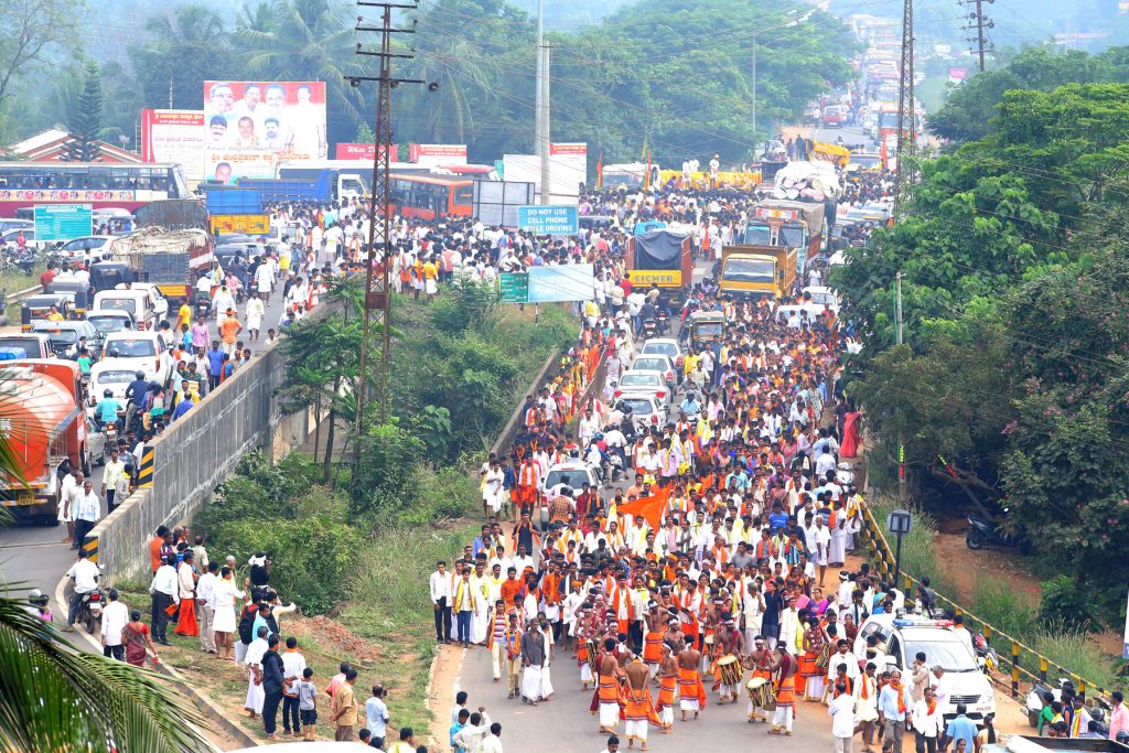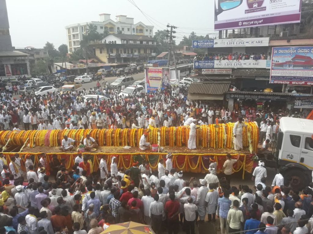 ಬಿ.ಸಿ.ರೋಡಿನ ಬ್ರಹ್ಮಶ್ರೀ ನಾರಾಯಣಗುರು ವೃತ್ತದ ಬಳಿ ಧ್ವಜ ಸ್ತಂಭಕ್ಕೆ ಧಾರ್ಮಿಕ ವಿಧಿ ವಿಧಾನದ ಬಳಿಕ ಕೇಂದ್ರದ ಮಾಜಿ ಸಚಿವ ಬಿ.ಜನಾರ್ದನ ಪೂಜಾರಿ ಅದ್ದೂರಿ ಮೆರವಣಿಗೆಗೆ ಚಾಲನೆ ನೀಡಿ ಶುಭ ಹಾರೈಸಿದರು.