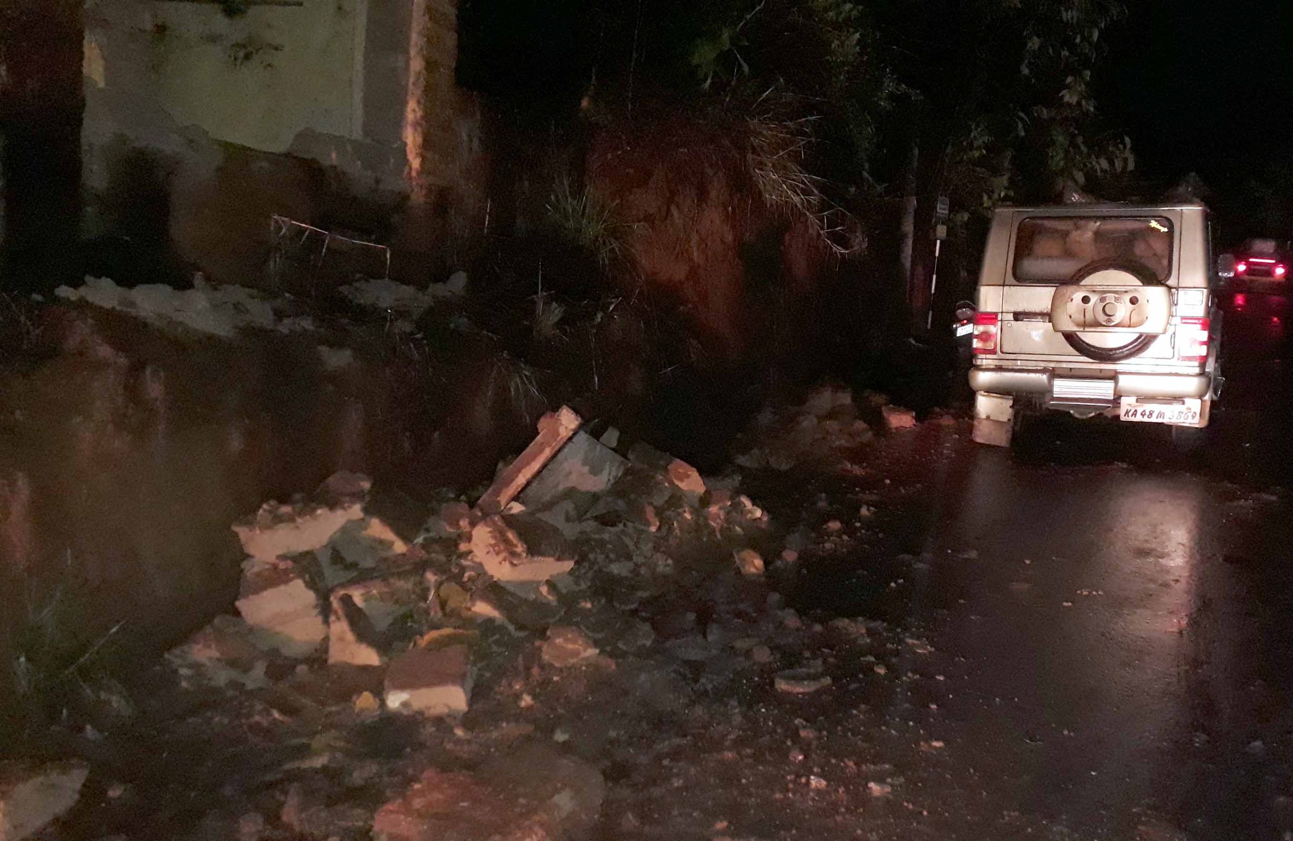ವಿಟ್ಲ ಭಾಗದಲ್ಲಿ ಭಾನುವಾರ ಸಂಜೆ ಸುರಿದ ಗುಡುಗು, ಮಿಂಚು ಸಹಿತ ಭಾರೀ ಮಳೆಗೆ ಜೀಪೊಂದರ ಮೇಲೆ ಧರೆ ಉರುಳಿ ಬಿತ್ತು. ವಿಟ್ಲ ಮುಡ್ನೂರು ಗ್ರಾಮದ ದಿನೇಶ್ ಗೌಡ ಅವರಿಗೆ ಸೇರಿದ ಬೊಲೆರೋ ಜೀಪನ್ನು ವಿಟ್ಲ-ಪುತ್ತೂರು ರಸ್ತೆಯ ಚಂದ್ರನಾಥ ಸ್ವಾಮೀ ಬಸದಿ ಬಳಿಯ ರಸ್ತೆ ಬದಿಯಲ್ಲಿ ನಿಲ್ಲಿಸಲಾಗಿತ್ತು. ನಿರಂತರವಾಗಿ ಸುರಿದ ಮಳೆಗೆ ಧರೆಯ ಮಣ್ಣುಗಳು ಬೊಲೆರೋ ಮೇಲೆ ಉರುಳಿದೆ. ಇದರಿಂದ ವಾಹನ ಹಾನಿಗೊಂಡಿತು. ಬಂಟ್ವಾಳ ತಾಲೂಕಿನಲ್ಲಿ ಸಂಜೆ ಪ್ರಾರಂಭಗೊಂಡ ಮಳೆ ರಾತ್ರಿ ವರೆಗೂ ಮುಂದುವರೆದಿದೆ. ಬಹುತೇಕ ಮನೆಯೊಳಗಡೆ ನೀರು ನುಗ್ಗಿದ ಬಗ್ಗೆ ವರದಿಯಾಗಿದೆ. ಮಿಂಚು ಸಿಡಿಲಿನ ಅಬ್ಬರಕ್ಕೆ ವಿದ್ಯುತ್ ಸಂಪರ್ಕ ಸ್ಥಗಿತಗೊಂಡಿತ್ತು.