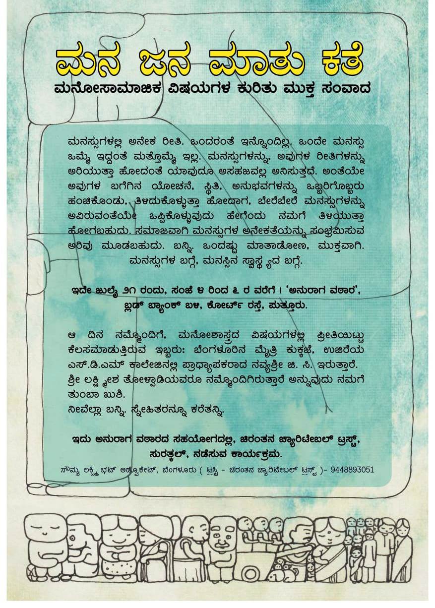 ಈ ಸರಣಿಯಲ್ಲಿ ಇನ್ನೂ ಅನೇಕರು ಸಂವಾದಗಳಲ್ಲಿ ಪಾಲ್ಗೊಳ್ಳುವುದರ ಜೊತೆಗೆ ಸಂಗೀತ, ಕತೆ, ಚಿತ್ರ, ನಾಟಕ, ಸಿನಿಮಾಗಳ ಮೂಲಕ ಮನಸ್ಸುಗಳ ಬಗ್ಗೆ, ಮನಸ್ಸುಗಳಿಂದಲೇ ನಿರ್ಮಿತವಾದ ಸಮಾಜದ ಬಗ್ಗೆ ಕಾರ್ಯಕ್ರಮಗಳನ್ನು ಹಮ್ಮಿಕೊಳ್ಳುವ ಯೋಜನೆಗಳಿವೆ. ಇದು ಸಾರ್ವಜನಿಕ ಕಾರ್ಯಕ್ರಮ. ಎಲ್ಲರಿಗೂ ಮುಕ್ತ ಆಮಂತ್ರಣ.