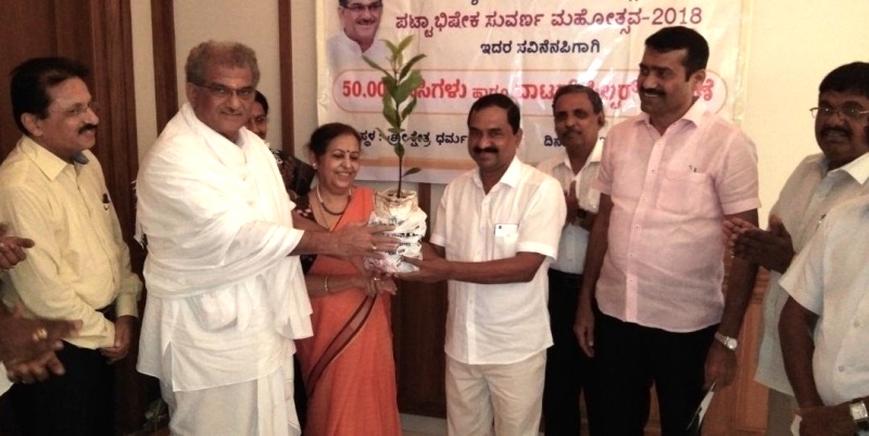 ಡಾ ಹೆಗ್ಗಡೆಯವರ ಪಟ್ಟಾಭಿಷೇಕದ ೫೦ನೇ ವರ್ಷದ ಸಂದರ್ಭದಲ್ಲಿ ಭಾರತೀಯ ಜೈನ್ ಮಿಲನ್ ವಲಯ ೮ ರ ವತಿಯಿಂದ ೫೦ ಸಾವಿರ ಗಿಡಗಳನ್ನು ನೆಡುವ ಹಾಗೂ ವಿತರಿಸುವ ಯೋಜನೆ ಹಮ್ಮಿಕೊಳ್ಳಲಾಗಿದ್ದು ಅದರಂತೆ ಮಂಗಳೂರು,ಬಂಟ್ವಾಳ, ಪುತ್ತೂರು ತಾಲೂಕು ಮಿಲನ್ಗಳ ವತಿಯಿಂದ ಸುಮಾರು ೫ ಸಾವಿರ ಗಿಡಗಳನ್ನು ನೆಡುವ ಯೋಜನೆ ಹಮ್ಮಿಕೊಳ್ಳಲಾಗಿದೆ. ಈ ಭಾಗದ ಜೈನ್ ಮಿಲನ್ ನಿರ್ದೇಶಕರಾದ ಸುದರ್ಶನ್ ಜೈನ್ ಅವರಿಗೆ ಹೆಗ್ಗಡೆಯವರು ಗಿಡ ವಿತರಿಸುವ ಮೂಲಕ ಚಾಲನೆ ನೀಡಿದರು. ಈ ಸಂದರ್ಭ ಹೇಮಾವತಿ ಹೆಗ್ಗಡೆ,, ಮಿಲನ್ ಪದಾಧಿಕಾರಿಗಳಾದ ಡಾ. ಯಶೋವರ್ಮ ಜೈನ್ ಉಜಿರೆ, ಪುಷ್ಪರಾಜ ಜೈನ್ ಮಂಗಳೂರು, ಸುಭಾಶ್ಚಂದ್ರ ಜೈನ್ ಬಂಟ್ವಾಳ, ಜೀವಂಧರ ಜೈನ್ ಬೆಳ್ತಂಗಡಿ, ಸೋಮಶೇಖರ ಶೆಟ್ಟಿ ಬೆಳ್ತಂಗಡಿ ಮುಂತಾದವರು ಉಪಸ್ಥಿತರಿದ್ದರು.