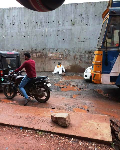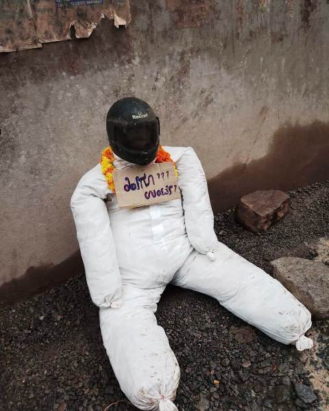 ರಸ್ತೆಯಲ್ಲಿ ಬೃಹತ್ ಗಾತ್ರದ ಹೊಂಡಗಳು ಇದ್ದು, ಎಷ್ಟು ಬಾರಿ ತೇಪೆ ಹಾಕಿದರೂ ಫಲಪ್ರದವಾಗದ ಕಾರಣ, ಸ್ಥಳೀಯರು ಮನುಷ್ಯನ ರೀತಿಯ ಗೊಂಬೆಯೊಂದನ್ನು ತಯಾರಿಸಿ ಬಿಳಿ ಪ್ಯಾಂಟ್, ಬಿಳಿ ಕುರ್ತಾ ಹಾಕಿ, ತಲೆಗೆ ಹೆಲ್ಮೆಟ್ ಇಟ್ಟು, ಕೊರಳಿಗೆ ಹಾರ ಹಾಕಲಾಯಿತು.