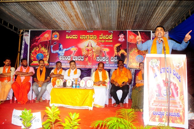 ಹಿಂದು ಜಾಗರಣ ವೇದಿಕೆ ಬಂಟ್ವಾಳ ತಾಲೂಕು ಘಟಕದ ವತಿಯಿಂದ ಅಖಂಡ ಭಾರತ ಸಂಕಲ್ಪ ದಿನದ ಅಂಗವಾಗಿ ಕೈಕಂಬ ಪೊಳಲಿ ದ್ವಾರದಿಂದ ಬಿಸಿರೋಡು ರಕ್ತೇಶ್ವರಿ ದೇವಿ ದೇವಸ್ಥಾನ ದ ವರೆಗೆ ಪಂಜಿನ ಮೆರವಣಿಗೆ ಮಂಗಳವಾರ ರಾತ್ರಿ ನಡೆಯಿತು. ಬಳಿಕ ಬಿ.ಸಿ.ರೋಡಿನ ರಕ್ತೇಶ್ವರಿ ದೇವಿ ದೇವಸ್ಥಾನ ದ ಬಳಿಯ ವೇದಿಕೆಯಲ್ಲಿ ಸಭಾ ಕಾರ್ಯಕ್ರಮ ನಡೆದ ಸಂದರ್ಭ ಅವರು ಮಾತನಾಡಿದರು.