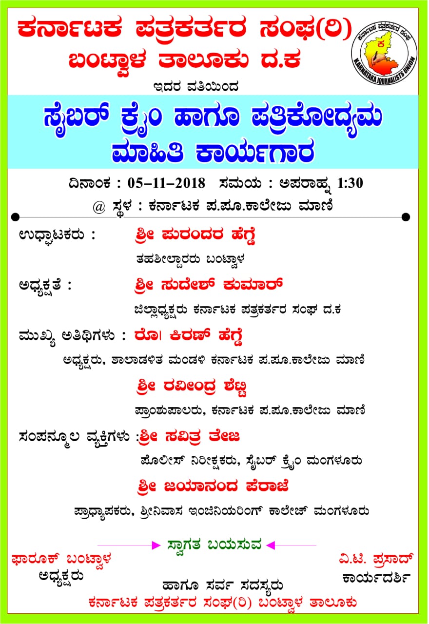 ಕರ್ನಾಟಕ ಪತ್ರಕರ್ತರ ಸಂಘ (ರಿ) ಬಂಟ್ವಾಳ ತಾಲೂಕು ಇದರ ವತಿಯಿಂದ ಸೈಬರ್ ಕ್ರೈಂ ಹಾಗೂ ಪತ್ರಿಕೋದ್ಯಮ ಮಾಹಿತಿ ಕಾರ್ಯಾಗಾರವು ನವೆಂಬರ್ 5 ರಂದು ಅಪರಾಹ್ನ 1.30 ಕ್ಕೆ ಮಾಣಿ ಕರ್ನಾಟಕ ಪದವಿಪೂರ್ವ ಕಾಲೇಜಿನಲ್ಲಿ ನಡೆಯಲಿದೆ.
