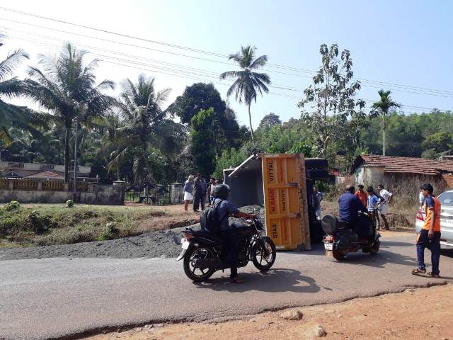 ವಿಟ್ಲ ರಸ್ತೆ ಮೂಲಕ ಕೇರಳ ಕಡೆಗೆ ಜಲ್ಲಿ ಹುಡಿ ಸಾಗಾಟ ಮಾಡುತ್ತಿದ್ದ ಟಿಪ್ಪರ್ ಲಾರಿ ಉಕ್ಕುಡ ಭಜನಾ ಮಂದಿರ ಮುಂಭಾಗ ಇನ್ನೊಂದು ವಾಹನಕ್ಕೆ ಡಿಕ್ಕಿ ಹೊಡೆಯುವುದನ್ನು ತಪ್ಪಿಸುವ ಭರದಲ್ಲಿ ಚಾಲಕನ ನಿಯಂತ್ರಣ ಕಳೆದು ರಸ್ತೆ ಉರುಳಿದೆ. ಘಟನೆಯಲ್ಲಿ ಚಾಲಕನ ತಲೆ ಗಾಯವಾಗಿದ್ದು, ವಿಟ್ಲದ ಆಸ್ಪತ್ರೆಗೆ ದಾಖಲು ಮಾಡಲಾಗಿದೆ. ಜಲ್ಲಿ ಹುಡಿ ರಸ್ತೆಯಲ್ಲಿ ಚೆಲ್ಲಾಪಿಲ್ಲಿಯಾಗಿ ಬಿದ್ದಿದೆ.