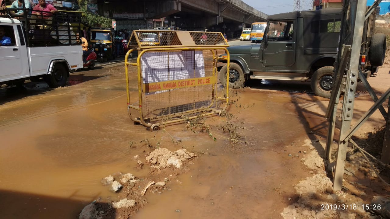 ಗಾಯದ ಮೇಲೆ ಬರೆ ಎಳೆದಂತೆ ಸರ್ವೀಸ್ ರಸ್ತೆಯಲ್ಲಿ ಬಿರುಬೇಸಗೆಯಲ್ಲೂ ಸೋಮವಾರ ಕೆಸರುನೀರು ಕಾಣಿಸಿಕೊಂಡಿತು. ಪೈಪ್ ಸಮಸ್ಯೆಯಿಂದಾಗಿ ನೀರು ರಸ್ತೆಯಲ್ಲೇ ಹರಿಯತೊಡಗಿತು.