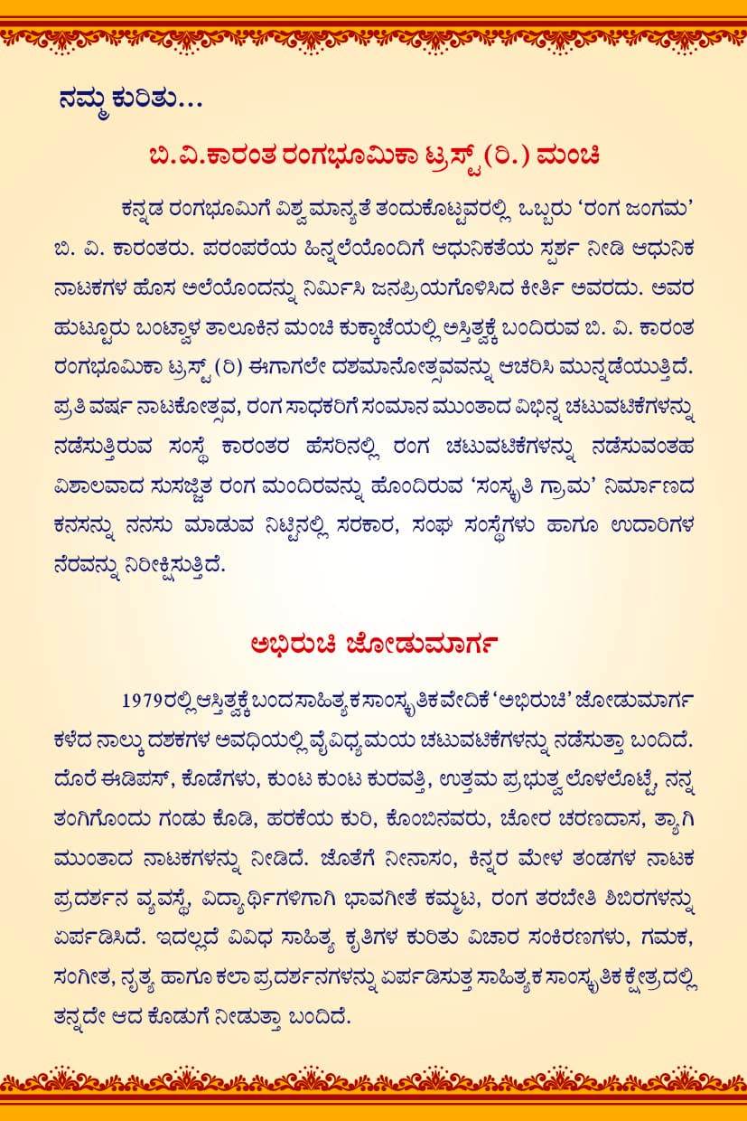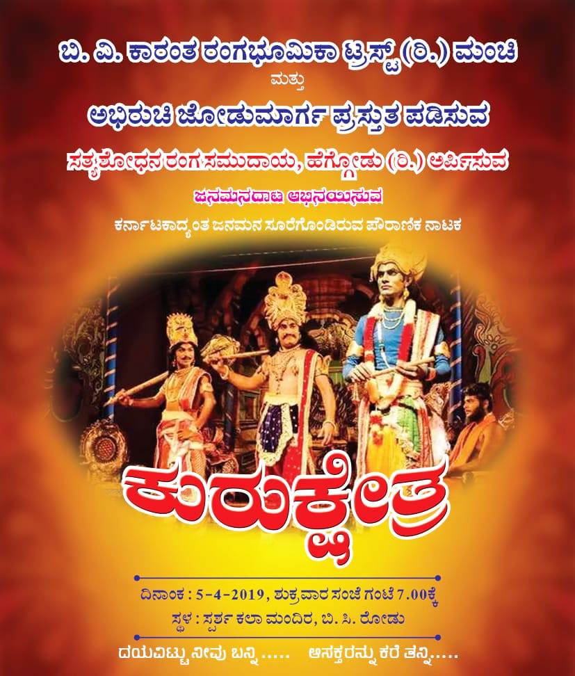 ಬಿ.ವಿ.ಕಾರಂತ ರಂಗಭೂಮಿಕಾ ಟ್ರಸ್ಟ್ (ರಿ) ಮಂಚಿ ಮತ್ತು ಅಭಿರುಚಿ ಜೋಡುಮಾರ್ಗ ಪ್ರಸ್ತುತಪಡಿಸುವ ಸತ್ಯಶೋಧನಾ ರಂಗ ಸಮುದಾಯ, ಹೆಗ್ಗೋಡು (ರಿ) ಅರ್ಪಿಸುವ ಕುರುಕ್ಷೇತ್ರ ನಾಟಕವೊಂದು ಅಪರೂಪದ ಪ್ರಯೋಗವಾಗಿದ್ದು, ಬಂಟ್ವಾಳ, ಮಂಗಳೂರು ಮತ್ತು ಪುತ್ತೂರು ಸುತ್ತಮುತ್ತಲಿನ ರಂಗಾಸಕ್ತರಿಗೆ ಇದೊಂದು ಸದವಕಾಶ ಎಂದು ಆಯೋಜಕರಾದ ಬಿ.ವಿ.ಕಾರಂತ ರಂಗಭೂಮಿಕಾ ಟ್ರಸ್ಟ್ ಅಧ್ಯಕ್ಷ ಕಜೆ ರಾಮಚಂದ್ರ ಭಟ್ ಮತ್ತು ಅಭಿರುಚಿ ಜೋಡುಮಾರ್ಗದ ಮಹಾಬಲೇಶ್ವರ ಹೆಬ್ಬಾರ ಪ್ರಕಟಣೆಯಲ್ಲಿ ತಿಳಿಸಿದ್ದಾರೆ.