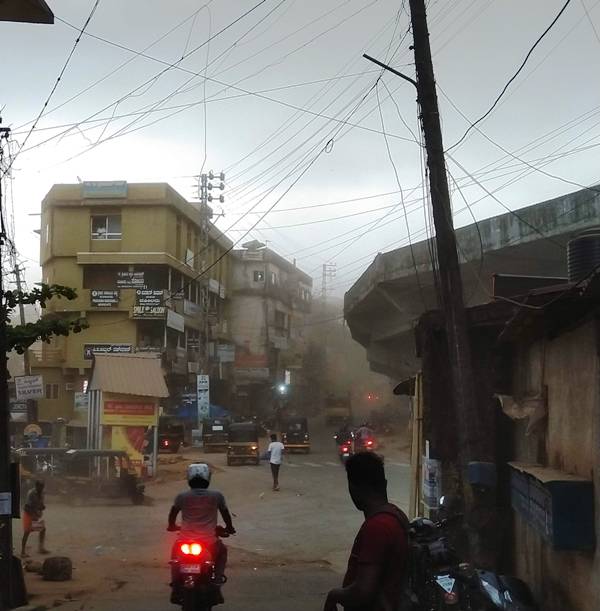 ಸಂಜೆ ಸುಮಾರು ಐದೂವರೆ ವೇಳೆಗೆ ಇದ್ದಕ್ಕಿದ್ದಂತೆ ದಟ್ಟ ಮೋಡ ಕವಿದು ಬಲವಾದ ಗಾಳಿ ಬೀಸಿದ ಕಾರಣ ಬಸ್ ಗೆ ಕಾಯುತ್ತಿದ್ದವರು, ಅಂಗಡಿ ಮುಂಭಾಗ ನಿಂತಿದ್ದವರು, ರಸ್ತೆಯಲ್ಲಿ ಸಂಚರಿಸುತ್ತಿದ್ದವರ ಮೇಲೆ ಧೂಳಿನ ಸ್ನಾನವಾಯಿತು. ಒಡನೆಯೇ ತುಂತುರು ಮಳೆಯೂ ಸುರಿದು ವಾತಾವರಣವನ್ನು ತಂಪಾಗಿಸಿತು. ಗಾಳಿಯಿಂದಾಗಿ ಕೆಲ ಅಂಗಡಿಗಳ ಬೋರ್ಡುಗಳು ಬಿದ್ದಿದ್ದು, ಪ್ಲಾಸ್ಟಿಕ್ ವಸ್ತುಗಳೆಲ್ಲ ಹಾರಾಡತೊಡಗಿದ್ದು ಕಂಡುಬಂತು. ಬಂಟ್ವಾಳ ಸಮೀಪದ ಅಮ್ಟಾಡಿ ಗ್ರಾಮದ ಬೆದ್ರಗುಡ್ಡೆ ಎಂಬಲ್ಲಿ ಗಾಳಿ ಮಳೆಗೆ ಮೋಹನ ಜೋಗಿ ಎಂಬವರ ಮನೆಗೆ ತೆಂಗಿನ ಮರ ಬಿದ್ದು ಸಂಪೂರ್ಣ ಜಖಂ ಆಗಿರುತ್ತದೆ. ಅಮ್ಟಾಡಿ ಗ್ರಾಮ ಲೆಕ್ಕಾಧಿಕಾರಿ ಶಶಿಕುಮಾರ್ ಸ್ಥಳ ಪರಿಶೀಲನೆ ನಡೆಸಿ ಮಹಜರು ನಡೆಸಿದರು. ಗಾಳಿಯಿಂದಾಗಿ ವಿದ್ಯುತ್ ಪೂರೈಕೆ ಅಸ್ತವ್ಯಸ್ತಗೊಂಡಿದ್ದು, ಕೆಲ ಹೊತ್ತಿನಲ್ಲೇ ಸೆಖೆಯ ವಾತಾವರಣ ಮೂಡಲಾರಂಭಿಸಿತು.