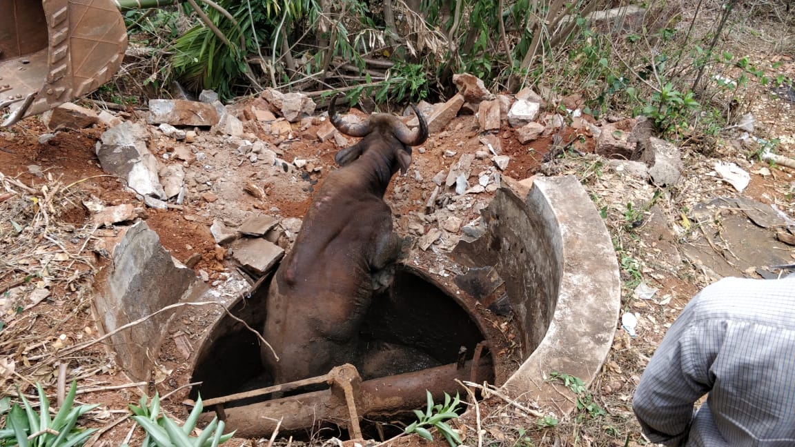 ಗೋಬರ್ ಗ್ಯಾಸ್ ಗುಂಡಿಯೊಳಗೆ ಬಿದ್ದಿದ್ದ ಕಾಡುಕೋಣವೊಂದು ಕೊನೆಗೂ ಯಶಸ್ವಿಯಾಗಿ ಮೇಲೆ ಬಂದಿದೆ!