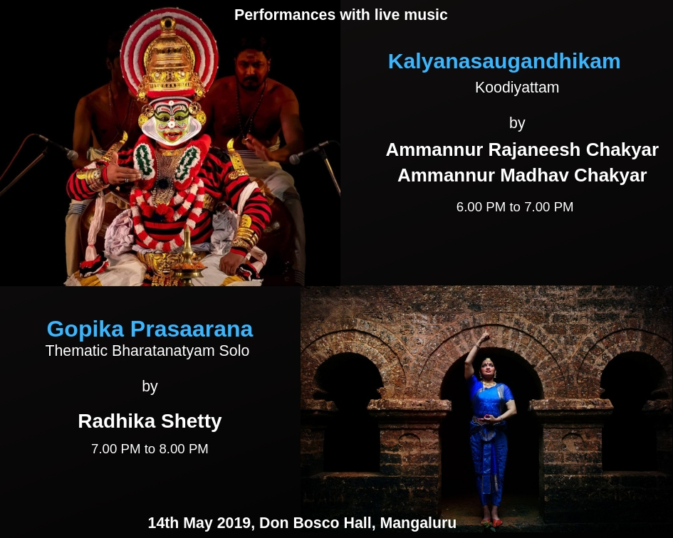 ಮಂಗಳೂರು: ನಗರದ ಡಾನ್ಬಾಸ್ಕೋ ಸಭಾಂಗಣದಲ್ಲಿ ಮೇ 14ರಂದು ಕೂಡಿಯಾಟ್ಟಂ ಹಾಗೂ ಭರತನಾಟ್ಯ ಪ್ರದರ್ಶನ ನಡೆಯಲಿದೆ. ಸಂಜೆ 6 ಗಂಟೆಯಿಂದ 7ರವರೆಗೆ ಅಮ್ಮನೂರ್ ರಜನೀಶ್ ಚಾಕ್ಯಾರ್ ಮತ್ತು ಅಮ್ಮನೂರ್ ಮಾಧವ ಚಾಕ್ಯಾರ್ ತ್ರಿಶೂರ್ ಬಳಗದಿಂದ ಕೂಡಿಯಾಟ್ಟಂ (ಪ್ರಸಂಗ: ಕಲ್ಯಾಣ ಸೌಗಂಧಿಕಂ) ಪ್ರದರ್ಶನಗೊಳ್ಳಲಿದೆ.