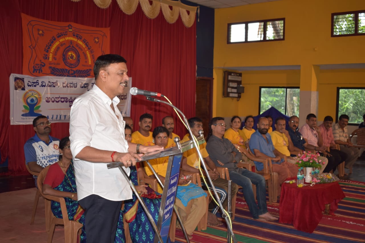 ಶ್ರೀ ಪತಂಜಲಿ ಯೋಗ ಶಿಕ್ಷಣ ಸಮಿತಿ ಹಾಗೂ ಎಸ್ವಿಎಸ್ ದೇವಳ ವಿದ್ಯಾಸಂಸ್ಥೆಯ ಆಶ್ರಯದಲ್ಲಿ ಅಂತರಾಷ್ಟ್ರೀಯ ಯೋಗ ದಿನಾಚರಣೆಯ ಅಂಗವಾಗಿ ಬಂಟ್ವಾಳದ ನೇತ್ರಾವತಿ ನದಿ ಕಿನಾರೆಯಲ್ಲಿರುವ ಶ್ರೀ ತಿರುಮಲ ವೆಂಕಟರಣ ದೇವಸ್ಥಾನ ಕಲ್ಯಾಣ ಮಂಟಪದ ಸಭಾಂಗಣ ಹಾಗೂ ಹೊರಾಂಗಣದಲ್ಲಿ ಯೋಗಾಭ್ಯಾಸದ ಸಭಾ ಕಾರ್ಯಕ್ರಮದಲ್ಲಿ ಮಾತನಾಡಿದರು