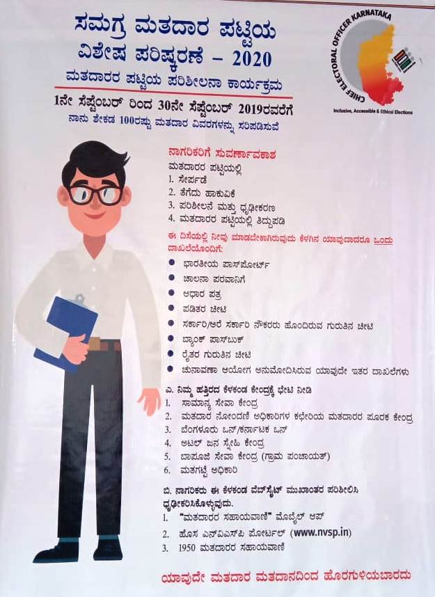 ಸಮಗ್ರ ಮತದಾರರ ಪಟ್ಟಿಯ ವಿಶೇಷ ಪರಿಷ್ಕರಣೆ-2020 ಕುರಿತು ಮತದಾರರ ಪಟ್ಟಿಯ ಸೇರ್ಪಡೆ, ತೆಗೆದು ಹಾಕುವಿಕೆ ಹಾಗೂ ಮತದಾರರ ಪಟ್ಟಿಯ ಪರಿಶೀಲನಾ ಕಾರ್ಯಕ್ರಮವನ್ನು ಹಮ್ಮಿಕೊಳ್ಳಲಾಗಿದೆ.