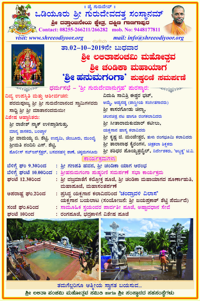 ಒಡಿಯೂರು ಶ್ರೀಗಳವರ ದಿವ್ಯ ಕಲ್ಪನಾಶಕ್ತಿಯ ಅನಾವರಣವಾಗಿ ಶ್ರೀ ಸಂಸ್ಥಾನದಲ್ಲಿ ನಿರ್ಮಾಣಗೊಂಡಿರುವ ’ಶ್ರೀಹನುಮಗಂಗಾ ಪುಷ್ಕರಿಣಿ’ ಅ. 2, ಶ್ರೀ ಲಲಿತಾ ಪಂಚಮಿ ಮಹೋತ್ಸವದಂದು ಲೋಕಾರ್ಪಣೆಗೆ ಸಿದ್ಧಗೊಳ್ಳುತ್ತಿದೆ.