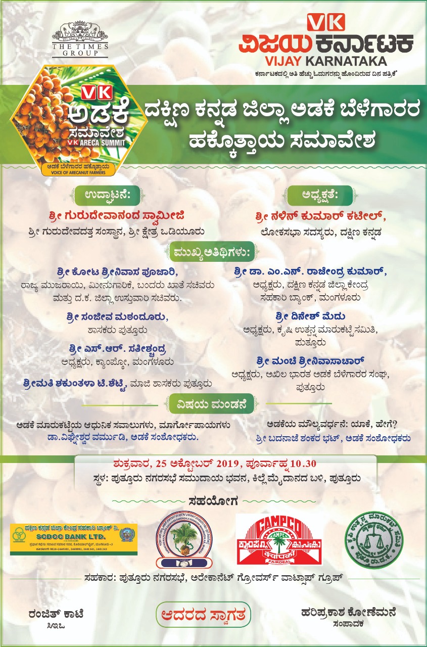 ಅಡಕೆ ಅಸ್ತಿತ್ವದ ಉಳಿವಿನ ಹೋರಾಟಕ್ಕೆ ವಿಜಯ ಕರ್ನಾಟಕ ವೇದಿಕೆ ಕಲ್ಪಿಸಿದೆ. ಅಕ್ಟೋಬರ್ 25ರಂದು ಶುಕ್ರವಾರ ಪೂರ್ವಾಹ್ನ 10.30ಕ್ಕೆ ಪುತ್ತೂರು ನಗರದ ಕಿಲ್ಲೆ ಮೈದಾನದ ಬಳಿಯಲ್ಲಿರುವ ನಗರಸಭೆಯ ಸಮುದಾಯ ಭವನದಲ್ಲಿ ಜಿಲ್ಲಾ ಮಟ್ಟದ ಅಡಕೆ ಬೆಳೆಗಾರರ ಸಮಾವೇಶ ನಡೆಯಲಿದೆ.