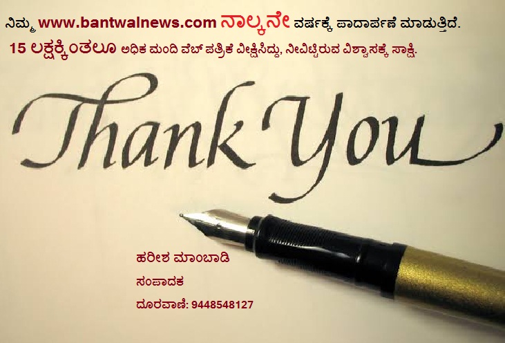 ಪ್ರತಿದಿನ ಏನಿದೆ ಇದರಲ್ಲಿ ಎಂದು ನೀವು ಇಣುಕಿ ನೋಡದೇ ಇದ್ದರೆ ನಾನು ಇದನ್ನು ಬರೆಯುತ್ತಲೇ ಇರಲಿಲ್ಲ. ಪ್ರತಿದಿನ ವೃತ್ತಪತ್ರಿಕೆಗಳ ಹಾಳೆ ತಿರುವಿ ಹಾಕುತ್ತಿದ್ದ, ಟಿ.ವಿ. ನೋಡುತ್ತಿದ್ದ ಬಂಟ್ವಾಳದವರು ಮೊಬೈಲ್ ಕ್ಲಿಕ್ ಮಾಡಿ ಏನಿದೆ ಸುದ್ದಿ ಎಂದು ನೋಡುವಂತೆ ಮಾಡಿದ ಮೊದಲ ವೆಬ್ ಪತ್ರಿಕೆ ನಿಮ್ಮ ಬಂಟ್ವಾಳನ್ಯೂಸ್ ಎಂಬುದು ಈಗ ಇತಿಹಾಸ. ನಿಮ್ಮ ಮುಂದಿರುವುದು ಒಂದು ಪ್ರಯತ್ನ. ಇದೀಗ ನಾಲ್ಕನೇ ಸಂವತ್ಸರಕ್ಕೆ ಕಾಲಿಡುತ್ತಿದೆ. ವೆಬ್ ಪತ್ರಿಕೆ ನಡೆಸುವುದೆಂದರೆ ಆರ್ಥಿಕ ಸಂಪನ್ಮೂಲಗಳು ಬೇಕು. ಕಾಲಕಾಲಕ್ಕೆ ಜಾಹೀರಾತು ಒದಗಿಸುವ ಮೂಲಕ ಪ್ರೋತ್ಸಾಹ ನೀಡಿದ ಸ್ನೇಹಿತರಿಗೆ, ವೆಬ್ ಆರಂಭಕ್ಕೆ ಹೆಗಲಿಗೆ ಹೆಗಲು ಕೊಟ್ಟ ಬಂಟ್ವಾಳ, ವಿಟ್ಲದ ಮಾಧ್ಯಮ ಬಂಧುಗಳಿಗೆ ಆಭಾರಿ. ಗುರುಹಿರಿಯರ ಆಶೀರ್ವಾದ ಹಿರಿಯರ ಮಾರ್ಗದರ್ಶನ, ಕಾಲಕಾಲಕ್ಕೆ ಹಿರಿಯ ಪತ್ರಕರ್ತರ ಸಲಹೆ ಸೂಚನೆಗಳು ನನಗೆ ಶ್ರೀರಕ್ಷೆ.