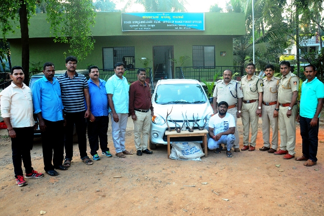 ಕೃಷ್ಣಮೃಗ, ಜಿಂಕೆ ಕೊಂಬುಗಳನ್ನು ಸಾಗಾಟ ಮಾಡಿ ಮಾರಲು ಯತ್ನಿಸುತ್ತಿದ್ದ ಕಂಕನಾಡಿ ಉಜ್ಜೋಡಿ ನಿವಾಸಿ ದಿಲೀಪ್ ಕುಮಾರ್ ಜಿ. (30) ಎಂಬಾತನನ್ನು ಮಂಗಳೂರು ಅರಣ್ಯ ಸಂಚಾರಿ ಪೊಲೀಸ್ ದಳ ಮತ್ತು ಬಂಟ್ವಾಳ ಅರಣ್ಯ ಇಲಾಖಾ ಸಿಬ್ಬಂದಿ ವಶಕ್ಕೆ ಪಡೆದಿದ್ದಾರೆ. ಸೋಮವಾರ ಮಧ್ಯಾಹ್ನ ಈ ಕಾರ್ಯಾಚರಣೆ ನಡೆದಿದ್ದು, ಆರೋಪಿಯಿಂದ ಕೃಷ್ಣ ಮೃಗದ ಎರಡು ಕೊಂಬುಗಳು ಹಾಗೂ ಜಿಂಕೆ ಮೃಗದ 4 ಕೊಂಬುಗಳು, ಮತ್ತು 3 ಲಕ್ಷ ಮೌಲ್ಯದ ಕಾರನ್ನು ವಶಪಡಿಸಿಕೊಳ್ಳಲಾಯಿತು.