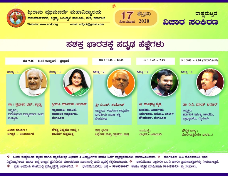 ಕಲ್ಲಡ್ಕ ವಿದ್ಯಾಕೇಂದ್ರದಲ್ಲಿ ಬುಧವಾರ ಸುದ್ದಿಗೋಷ್ಠಿಯನ್ನು ಉದ್ದೇಶಿಸಿ ಮಾತನಾಡಿದ ಅವರು, ಕಲ್ಲಡ್ಕ ಶ್ರೀರಾಮ ವಿದ್ಯಾಕೇಂದ್ರದ ವೇದವ್ಯಾಸ ಸಭಾಭವನದಲ್ಲಿ ನಡೆಯುವ ಕಾರ್ಯಕ್ರಮದ ದಿಕ್ಸೂಚಿ ಭಾಷಣದಲ್ಲಿ ವಿಚಾರಸಂಕಿರಣದ ಅಗತ್ಯ ಮತ್ತು ಅನಿವಾರ್ಯತೆ ಕುರಿತು ವಿವೇಕಾನಂದ ವಿದ್ಯಾವರ್ಧಕ ಸಂಘದ ಅಧ್ಯಕ್ಷ ಡಾ. ಕಲ್ಲಡ್ಕ ಪ್ರಭಾಕರ ಭಟ್ ಮಾಡಲಿದ್ದಾರೆ. ಬಳಿಕ ಪೌರತ್ವ ತಿದ್ದುಪಡಿ ಕಾಯ್ದೆ ಘಟನೆಗಳ ಸುತ್ತಮುತ್ತಲಿನ ವಿಶ್ಲೇಷಣೆಯನ್ನು ಕಲಾವಿದೆ, ನ್ಯಾಯವಾದಿ, ಸಾಮಾಜಿಕ ಕಾರ್ಯಕರ್ತೆ ಮಾಳವಿಕಾ ಅವಿನಾಶ್ ವಿವರಿಸಲಿದ್ದಾರೆ. ಬಿಜೆಪಿಯ ರಾಷ್ಟ್ರೀಯ ಸಂಘಟನಾ ಕಾರ್ಯದರ್ಶಿ ಬಿ.ಎಲ್.ಸಂತೋಷ್ ಸಶಕ್ತ ಭಾರತ, ಆರ್ಥಿಕತೆ ಮತ್ತು ರಕ್ಷಣೆಯ ಪಾತ್ರದ ಕುರಿತು ಮಾತನಾಡುವರು. ಅಪರಾಹ್ನ ನಡೆಯುವ ಗೋಷ್ಠಿಯಲ್ಲಿ ಚಿಂತಕ, ವಿಮರ್ಶಕ ಮತ್ತಿಘಟ್ಟ ಚೈತ್ರ ಜನಸಂಖ್ಯೆ ಲಾಭವೇ, ಅಪಾಯವೇ ಎಂಬ ಕುರಿತು ಮಾತನಾಡುವರು. ಅಪರಾಹ್ನ ನಡೆಯುವ ಸಮಾರೋಪದಲ್ಲಿ ಕರ್ನಾಟಕ ಸಾಹಿತ್ಯ ಅಕಾಡಮಿ ಅಧ್ಯಕ್ಷ ಡಾ.ಬಿ.ವಿ.ವಸಂತಕುಮಾರ್ ಅವರು ಬೌದ್ಧಿಕ ದಾಸ್ಯ ಮೇಲೇಳುತ್ತಿದೆಯೇ ಭಾರತ ಎಂಬ ವಿಚಾರದ ಕುರಿತು ಮಾತನಾಡುವರು ಎಂದು ವಿವರಿಸಿದರು.