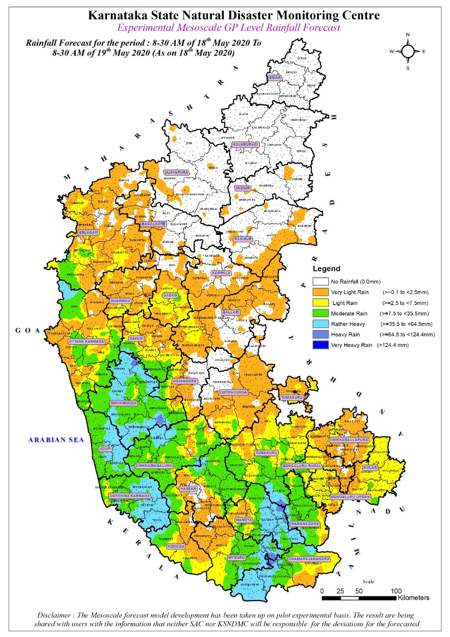 ಭಾರತೀಯ ಹವಾಮಾನ ಇಲಾಖೆ ಹೊರಡಿಸಿರುವ ಮುನ್ಸೂಚನೆಯಂತೆ ಅರಬ್ಬೀ ಸಮುದ್ರದ ಮೇಲ್ಮೈ ಸುಳಿಗಾಳಿ ಕಾಣಿಸಿಕೊಂಡಿದ್ದು, ಇದರ ಪ್ರಭಾವದಿಂದ ಕರ್ನಾಟಕದ ಕರಾವಳಿ ಭಾಗದಲ್ಲಿ ಮೇ.18 ಮತ್ತು 19ರಂದು ಭಾರಿ ಮಳೆಯಾಗುವ ಸಾಧ್ಯತೆ ಇದೆ.