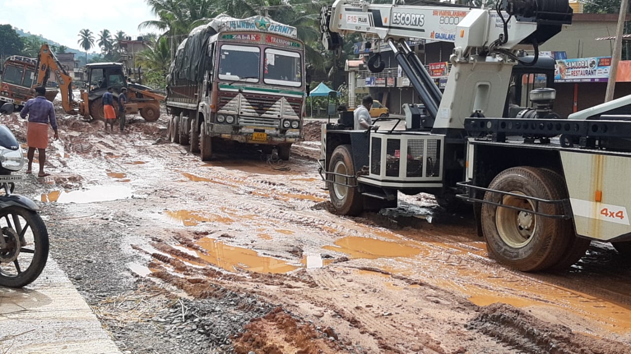 ಬಂಟ್ವಾಳದಲ್ಲಿ ಬಿ.ಸಿ.ರೋಡ್ ನಿಂದ ಜಕ್ರಿಬೆಟ್ಟುವರೆಗಿನ ರಸ್ತೆ ಅಗಲಗೊಳಿಸುವ ಕಾಮಗಾರಿ ನಡೆಯುತ್ತಿದ್ದು, ವಾಹನ ಸಂಚಾರಕ್ಕೆ ಅಡಚಣೆ ಉಂಟಾಗುತ್ತಿರುವುದು ಸಹಜ. ಆದರೆ ಕಳೆದ ಕೆಲ ದಿನಗಳಿಂದ ಮಳೆಯಾಗುತ್ತಿರುವ ಕಾರಣ ವಾಹನ ಸಂಚಾರಕ್ಕೆ ಮತ್ತಷ್ಟು ತೊಂದರೆ ಉಂಟಾಗುತ್ತಿದೆ. ಕೆಸರುಮಿಶ್ರಿತವಾಗಿರುವ ಮಣ್ಣಿನಲ್ಲಿ ಬೃಹತ್ ಲಾರಿಯೊಂದರ ಚಕ್ರಗಳು ಭಾನುವಾರ ಬೆಳಗ್ಗೆ ಹೂತುಹೋದ ದೃಶ್ಯಗಳಿವು.