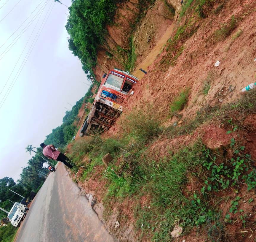 ಮಂಗಳೂರು- ಬೆಂಗಳೂರು ರಾಷ್ಟ್ರೀಯ ಹೆದ್ದಾರಿಯ ಮಾಣಿ ಸಮೀಪದ ಪಲ್ಕೆ ಎಂಬಲ್ಲಿ ಸೋಮವಾರ ಡಾಂಬರು ಸಾಗಿಸುತ್ತಿದ್ದ ಲಾರಿ ಪಲ್ಟಿಯಾಗಿದೆ. ಮಂಗಳೂರು ಕಡೆಯಿಂದ ಬೆಂಗಳೂರು ಕಡೆಗೆ ಹೋಗುತ್ತಿದ್ದ ವೇಳೆ ಚಾಲಕನ ನಿಯಂತ್ರಣ ತಪ್ಪಿ ರಸ್ತೆ ಬದಿಗೆ ಸರಿದ ಲಾರಿ ಪಲ್ಟಿಯಾಗಿದೆ. ಚತುಷ್ಟಥ ಕಾಮಗಾರಿ ಹಿನ್ನೆಲೆಯಲ್ಲಿ ಅಗೆದು ಹಾಕಿರುವ ರಸ್ತೆ ಬದಿಯ ಹೊಂಡಕ್ಕೆ ಲಾರಿ ಬಿದ್ದು ಪಲ್ಟಿಯಾಗಿದೆ. ಘಟನೆಯಲ್ಲಿ ಲಾರಿ ಚಾಲಕ ಯಾವುದೇ ಪ್ರಾಣಾಪಾಯವಿಲ್ಲದೆ ಪಾರಾಗಿದ್ದಾನೆ. ಸ್ಥಳಕ್ಕೆ ವಿಟ್ಲ ಪೋಲಿಸರು ಭೇಟಿ ನೀಡಿ ತನಿಖೆ ನಡೆಸಿದರು.