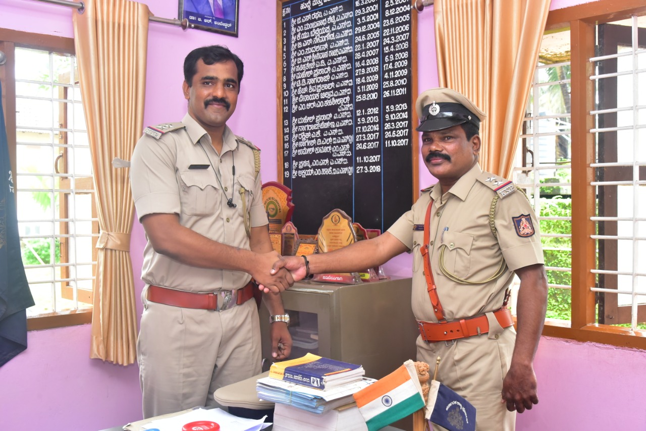 ಕ್ರೈಮ್ ಎಸ್.ಐ. ಸಂಜೀವ (ಬಲದಲ್ಲಿರುವವರು) ಅವರಿಗೆ ಹಸ್ತಲಾಘವ ಮಾಡುತ್ತಿರುವ ಬಂಟ್ವಾಳ ಗ್ರಾಮಾಂತರ ಠಾಣೆಯ ಎಸ್.ಐ. ಪ್ರಸನ್ನ (ಎಡದಲ್ಲಿರುವವರು)
