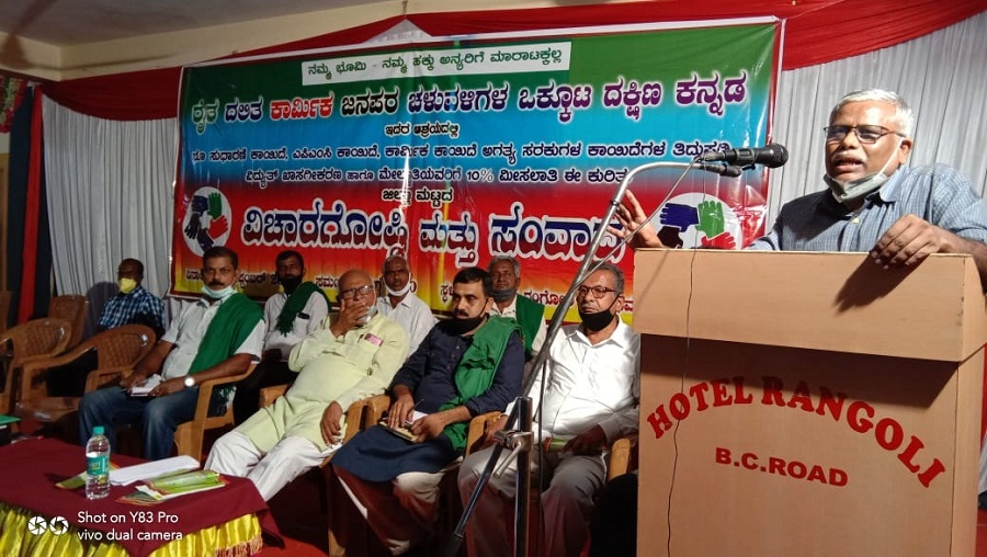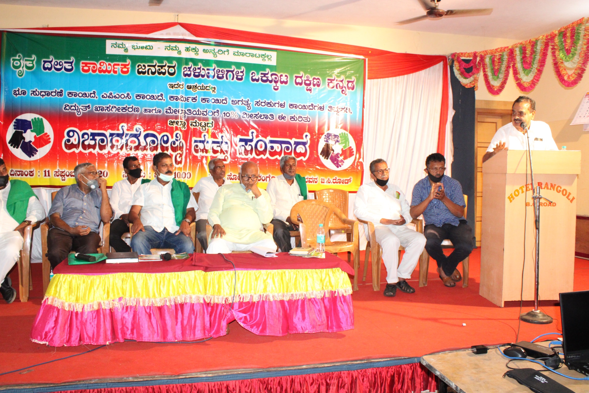 ರೈತ ದಲಿತ ಕಾರ್ಮಿಕ ಜನಪರ ಚಳವಳಿಗಳ ಒಕ್ಕೂಟ ವತಿಯಿಂದ ಭೂ ಸುಧಾರಣಾ ಕಾಯಿದೆ, ಎಪಿಎಂಸಿ ಕಾಯಿದೆ, ಕಾರ್ಮಿಕ ಕಾನೂನು ಅಗತ್ಯ ಸರಕುಗಳ ಕಾಯಿದೆಗಳ ತಿದ್ದುಪಡಿ ವಿದ್ಯುತ್ ಖಾಸಗೀಕರಣ ಹಾಗೂ ಮೇಲ್ಜಾತಿಯವರಿಗೆ ಶೇ.10 ಮೀಸಲಾತಿ ವಿಷಯಗಳ ಕುರಿತು ಬಿ.ಸಿ.ರೋಡ್ ರಂಗೋಲಿ ಸಭಾಭವನದಲ್ಲಿ ಜಿಲ್ಲಾ ಮಟ್ಟದ ಮಟ್ಟದ ವಿಚಾರಗೋಷ್ಟಿ ಮತ್ತು ಸಂವಾದ ಕಾರ್ಯಕ್ರಮವನ್ನು ಉದ್ಘಾಟಿಸಿ ಅವರು ಮಾತನಾಡಿದರು.
