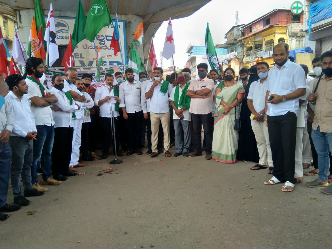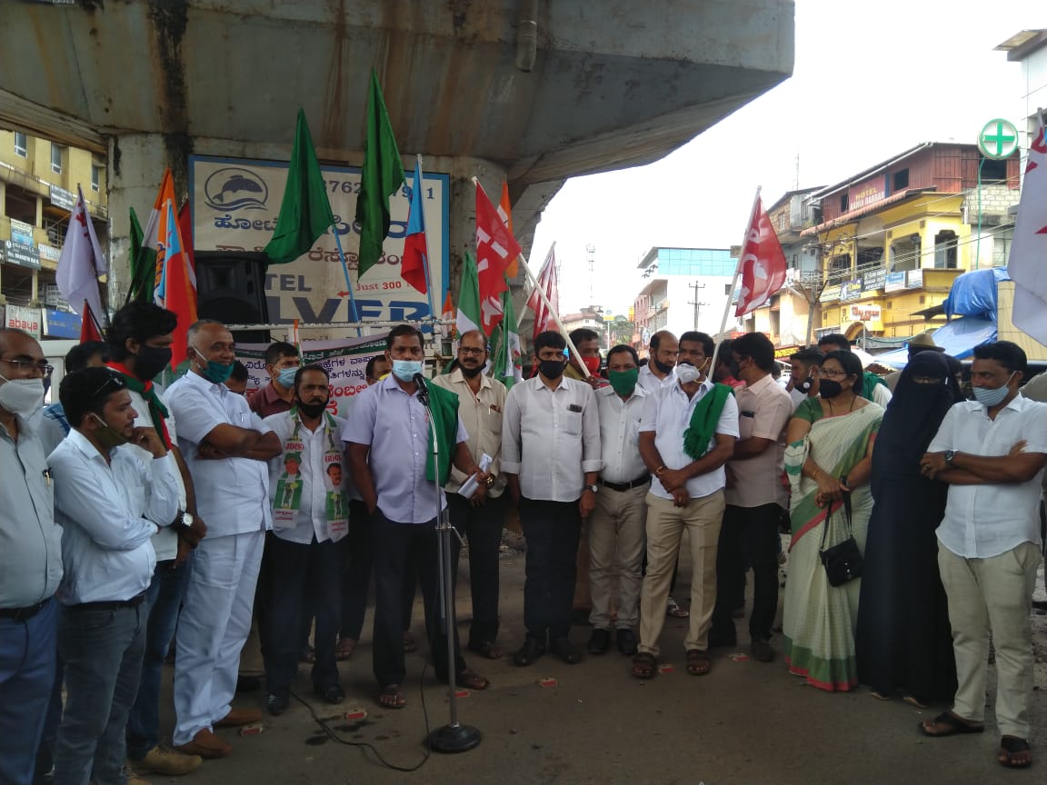 ರೈತ, ಕಾರ್ಮಿಕ ವಿರೋಧಿ ಕಾಯ್ದೆಗಳನ್ನು ಸರಕಾರ ಬಲವಂತವಾಗಿ ಜಾರಿಗೆ ತರುತ್ತಿದೆ ಎಂದು ಆರೋಪಿಸಿ ಕರ್ನಾಟಕ ರಾಜ್ಯ ರೈತ ಸಂಘ, ಕಾರ್ಮಿಕ ಸಂಘಟನೆಗಳು ಮತ್ತು ವಿವಿಧ ರಾಜಕೀಯ ಪಕ್ಷಗಳ ಸಹಕಾರದಿಂದ ಬಿ.ಸಿ.ರೋಡಿನಲ್ಲಿ ಸೋಮವಾರ ಪ್ರತಿಭಟನಾ ಸಭೆ ಆಯೋಜಿಸಿತು.