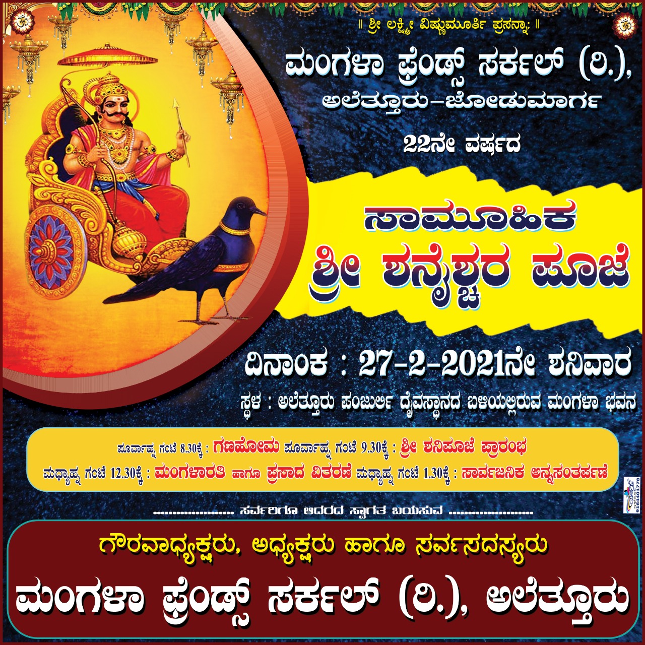 ಮಂಗಳಾ ಪ್ರೆಂಡ್ಸ್ ಸರ್ಕಲ್ ಅಲೆತ್ತೂರು ವತಿಯಿಂದ 22 ನೇ ವರ್ಷದ ಸಾಮೂಹಿಕ ಶ್ರೀ ಶನ್ಯೆಶ್ವರ ಪೂಜೆ ಫೆಬ್ರವರಿ 27 ರಂದು ಅಲೆತ್ತೂರು ಪಂಜುರ್ಲಿ ದೈವಸ್ಥಾನದ ಬಳಿ ಮಂಗಳ ಭವನದಲ್ಲಿ ನಡೆಯಲಿದೆ. ಕಾರ್ಯಕ್ರಮ ವಿವರ ಹೀಗಿದೆ. ಪೂರ್ವಾಹ್ನ 8.30ಕ್ಕೆ ಗಣಹೋಮ, 9.30 ಶ್ರಿ ಶನ್ಯೆಶ್ವರ ಪೂಜೆ ಪ್ರಾರಂಭ, ಮಧ್ಯಾಹ್ನ 12.30 ಮಂಗಳಾರತಿ ಹಾಗೂ ಪ್ರಸಾದ ವಿತರಣೆ, ಪೂಜಾವಿಧಿ ಕಾರ್ಯಕ್ರಮದ ನಂತರ ಮಧ್ಯಾಹ್ನ 1.00 ಗಂಟೆಗೆ ಸಾರ್ವಜನಿಕ ಅನ್ನ ಸಂತರ್ಪಣೆ ನಡೆಯಲಿದೆ.