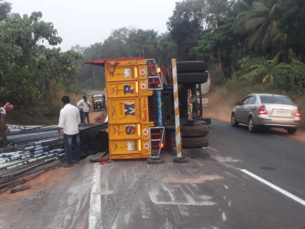 ಬಂಟ್ವಾಳ: ಚಾಲಕನ ನಿಯಂತ್ರಣವನ್ನು ಕಳೆದುಕೊಂಡ ಲಾರಿಯೊಂದು ಪಲ್ಟಿಯಾದ ಘಟನೆ ಶುಕ್ರವಾಋ ಬೆಳಗ್ಗೆ ಮಂಗಳೂರು ಬೆಂಗಳೂರು ರಾಷ್ಟ್ರೀಯ ಹೆದ್ದಾರಿಯ ಬುಡೋಳಿ ಎಂಬಲ್ಲಿ ನಡೆದಿದೆ.ಬೆಂಗಳೂರಿನಿಂದ ಮಂಗಳೂರಿಗೆ ಕಬ್ಬಿಣದ ರಾಡ್ ಗಳನ್ನು ತುಂಬಿಕೊಂಡು ತೆರಳುತ್ತಿದ್ದ ಲಾರಿಯೊಂದು ಚಾಲಕನ ನಿಯಂತ್ರಣ ತಪ್ಪಿ ರಸ್ತೆಯಲ್ಲಿ ಮಗುಚಿ ಬಿದ್ದಿದೆ. ಚಾಲಕ ಸಣ್ಣಪುಟ್ಟ ಗಾಯಗೊಂಡು ಅಪಾಯದಿಂದ ಪಾರಾಗಿದ್ದಾರೆ. ಘಟನೆಯಲ್ಲಿ ಕಬ್ಬಿಣದ ರಾಡ್ ಗಳು ರಸ್ತೆಗೆ ಚೆಲ್ಲಾಪಿಲ್ಲಿಯಾಗಿ ಬಿದ್ದು ಸಂಚಾರಕ್ಕೆ ಅಡಚಣೆ ಉಂಟಾಗಿದೆ.