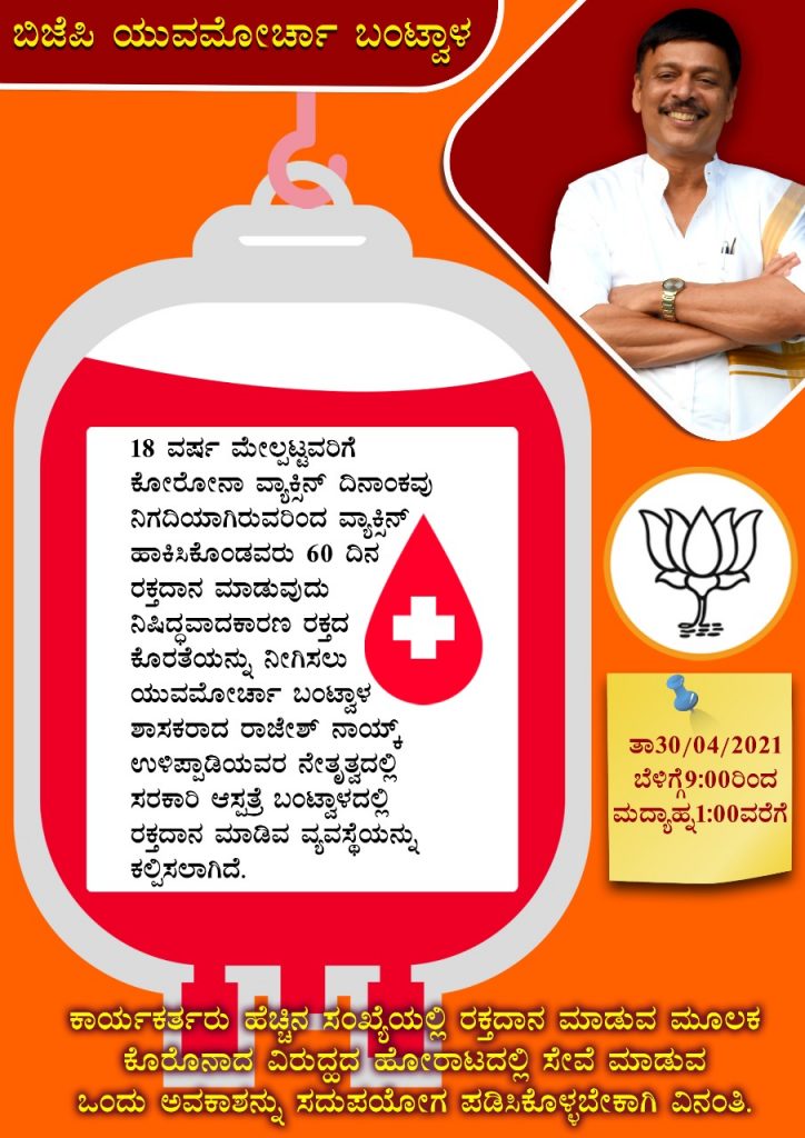 ಬಳಿಕ ಮಾತನಾಡಿದ ಶಾಸಕರು, ವಾರಕ್ಕೆ ಒಂದು ದಿನ ರಕ್ತದಾನ ಮಾಡಲು ಯುವಕರಿಗೆ ಮನವಿ ಮಾಡುತ್ತಿದ್ದೇವೆ. ರಕ್ತದಾನ ಮಾಡಿದ ನಂತರ ಲಸಿಕೆ ಪಡೆದುಕೊಳ್ಳಿ ಎಂದು ಎಲ್ಲರ ಸಹಕಾರಕ್ಕಾಗಿ ಮನವಿ ಮಾಡುತ್ತಿದ್ದೇನೆ. ತಾಲೂಕಿನ ವ್ಯಾಪ್ತಿಯಲ್ಲಿ 294 ಮಂದಿ ಕೋವಿಡ್ ಸೋಂಕಿನಿಂದ ಬಳಲುತ್ತಿದ್ದಾರೆ. ಇವರಲ್ಲಿ 205 ಮಂದಿ ಮನೆಯಲ್ಲಿ ಚಿಕಿತ್ಸೆ ಪಡೆಯುತ್ತಿದ್ದಾರೆ 31 ಮಂದಿ ಖಾಸಗಿ ಆಸ್ಪತ್ರೆಗೆ ದಾಖಲಾಗಿದ್ದಾರೆ. 9 ಮಂದಿ ಬಂಟ್ವಾಳ ಮತ್ತು 2 ವೆನ್ಲಾಕ್ ನಲ್ಲಿದ್ದಾರೆ. ಬಂಟ್ವಾಳ ತಾಲೂಕಿನಲ್ಲಿ ಎಲ್ಲರೂ ಲಸಿಕೆ ಪಡೆಯಬೇಕು. 60 ವರ್ಷಕ್ಕೆ ಮೇಲ್ಪಟ್ಟವರು 35278 ಮಂದಿ ಅರ್ಹರಿದ್ದರೆ, ಅದರಲ್ಲಿ 18313 ಮಂದಿ ತೆಗೆದುಕೊಂದ್ದಾರೆ. ಇದರಲ್ಲಿ ಕೇವಲ 52 ಶೇ. ಸಾಧನೆ ಆಗಿದ್ದರೆ, 45ರಿಂದ 60 ವರ್ಷದೊಳಗಿನ 73035 ಮಂದಿ ಅರ್ಹರಿದ್ದರೆ, 18125 ಮಂದಿ ತೆಗೆದುಕೊಂಡಿದ್ದಾರೆ ಇದರಲ್ಲಿ ಕೇವಲ 24 ಶೇ. ಸಾಧನೆಯಾಗಿದೆ.ಈ ಹಿನ್ನೆಲೆಯಲ್ಲಿ ವಾರ್ ರೂಮ್ ಮಾಡಿದ್ದು, ಪ್ರತಿ ಎರಡು ದಿನಕ್ಕೊಮ್ಮೆ 29 ಮಂದಿಯ ತಂಡ ವಿಡಿಯೋ ಕಾನ್ಫರೆನ್ಸ್ ಮೂಲಕ ಭೇಟಿಯಾಗುತ್ತೇವೆ. ಕೊರೊನಾಕ್ಕೆ ಸಂಬಂಧಿಸಿ ಇತ್ತೀಚಿಗಿನ ಮಾಹಿತಿ ಪಡೆದುಕೊಳ್ಳಲಾಗುವುದು ಎಂದರು.