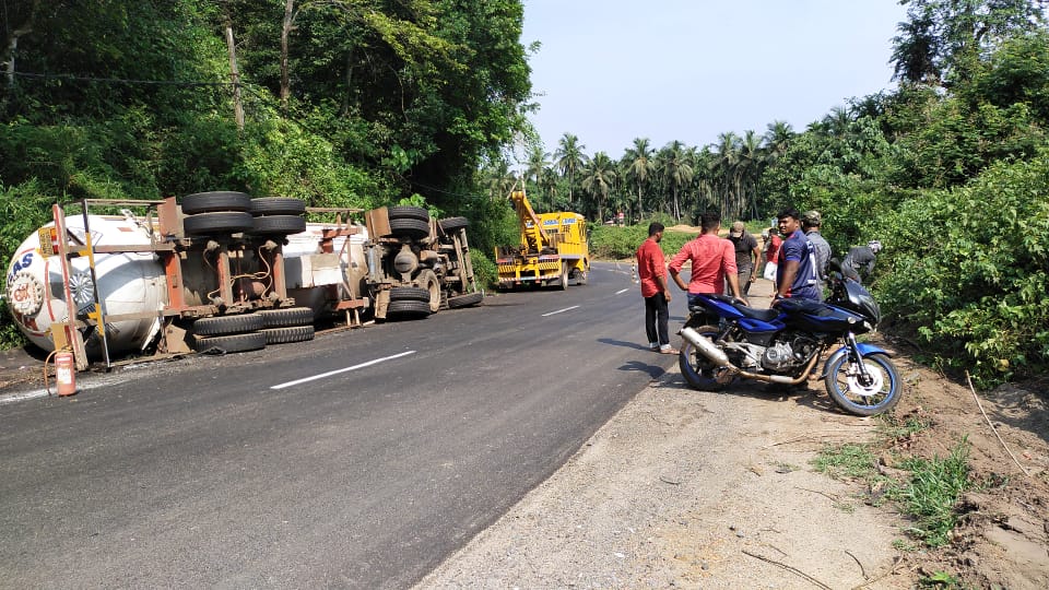 ಚಾಲಕನ ನಿಯಂತ್ರಣ ತಪ್ಪಿದ ಗ್ಯಾಸ್ ಟ್ಯಾಂಕರೊಂದು ರಸ್ತೆ ಬದಿ ಮಗುಚಿ ಬಿದ್ದ ಘಟನೆ ಶುಕ್ರವಾರದಂದು ಮಂಗಳೂರು – ಬೆಂಗಳೂರು ರಾಷ್ಟ್ರೀಯ ಹೆದ್ದಾರಿಯ ನೆಲ್ಯಾಡಿಯಲ್ಲಿ ನಡೆದಿದೆ. ಮಂಗಳೂರಿನಿಂದ ಬೆಂಗಳೂರು ಕಡೆಗೆ ಗ್ಯಾಸ್ ತುಂಬಿಕೊಂಡು ಹೊರಟಿದ್ದ ಟ್ಯಾಂಕರ್ ನೆಲ್ಯಾಡಿ ಸಮೀಪದ ಲಾವತ್ತಡ್ಕ ಎಂಬಲ್ಲಿ ತಿರುವಿನಲ್ಲಿ ಚಾಲಕನ ನಿಯಂತ್ರಣ ತಪ್ಪಿ ಉರುಳಿ ಬಿದ್ದಿದೆ. ಘಟನೆಯಲ್ಲಿ ಚಾಲಕ ಸಣ್ಣಪುಟ್ಟ ಗಾಯಗಳೊಂದಿಗೆ ಅಪಾಯದಿಂದ ಪಾರಾಗಿದ್ದಾರೆ. ಗ್ಯಾಸ್ ಸೋರಿಕೆ ಆಗದೆ ಇದ್ದುದರಿಂದ ಅನಾಹುತ ತಪ್ಪಿದೆ. ಸ್ಥಳಕ್ಕೆ ನೆಲ್ಯಾಡಿ ಹೊರಠಾಣಾ ಪೊಲೀಸರು ಭೇಟಿ ನೀಡಿ ಪರಿಶೀಲನೆ ನಡೆಸಿದ್ದಾರೆ.
