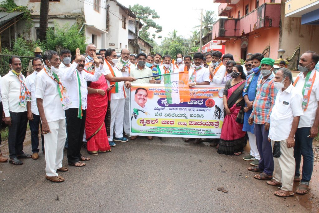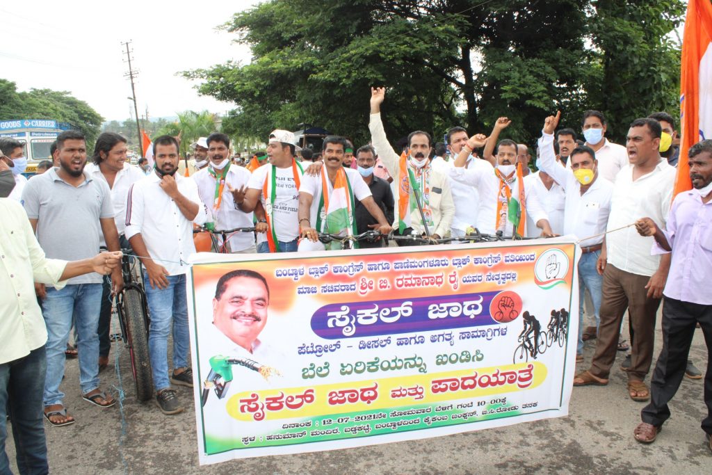ಬಂಟ್ವಾಳ: ತೈಲ ಬೆಲೆ ಏರಿಕೆಯನ್ನು ಖಂಡಿಸಿ, ಕೇಂದ್ರ ಸರ್ಕಾರದ ನೀತಿಗಳನ್ನು ಟೀಕಿಸಿ ಬಂಟ್ವಾಳ ಮತ್ತು ಪಾಣೆಮಂಗಳೂರು ಬ್ಲಾಕ್ ಕಾಂಗ್ರೆಸ್ ವತಿಯಿಂದ ಮಾಜಿ ಸಚಿವ ಬಿ.ರಮಾನಾಥ ರೈ ಮಾರ್ಗದರ್ಶನದಲ್ಲಿ ಬಂಟ್ವಾಳ ಬ್ಲಾಕ್ ಅಧ್ಯಕ್ಷ ಬೇಬಿ ಕುಂದರ್ ಮತ್ತು ಪಾಣೆಮಂಗಳೂರು ಬ್ಲಾಕ್ ಅಧ್ಯಕ್ಷ ಸುದೀಪ್ ಕುಮಾರ್ ಶೆಟ್ಟಿ ನೇತೃತ್ವದಲ್ಲಿ ಬಂಟ್ವಾಳ ಬಡ್ಡಕಟ್ಟೆ ಹನುಮಾನ್ ಮಂದಿರದಿಂದ ಬಿ.ಸಿ.ರೋಡಿನವರೆಗೆ ಪಾದಯಾತ್ರೆ ಮತ್ತು ಸೈಕಲ್ ಜಾಥಾ ನಡೆಯಿತು.
