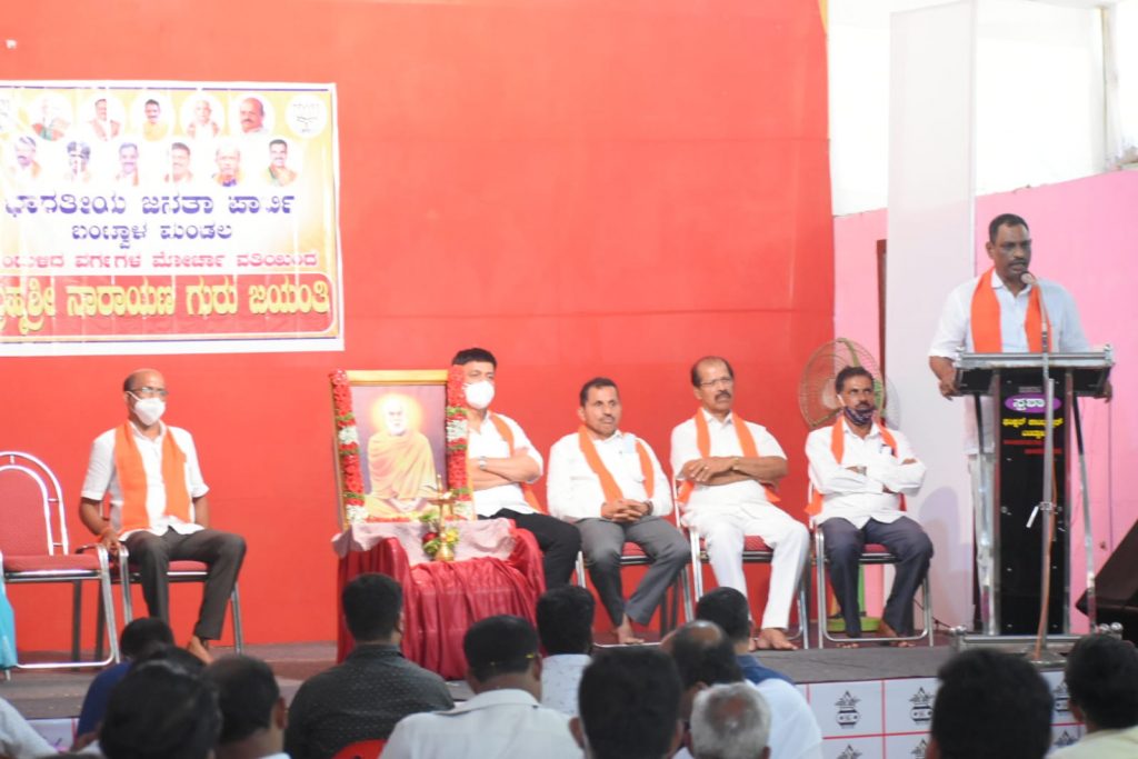 ಬಂಟ್ವಾಳದ ಸ್ಪರ್ಶ ಕಲಾ ಮಂದಿರದಲ್ಲಿ ಸೋಮವಾರ ಬಿಜೆಪಿ ಒಬಿಸಿ ಮೋರ್ಚಾ ವತಿಯಿಂದ ಏರ್ಪಡಿಸಲಾದ ಬ್ರಹ್ಮಶ್ರೀ ನಾರಾಯಣಗುರು ಜಯಂತಿ ಕಾರ್ಯಕ್ರಮವನ್ನು ಉದ್ಘಾಟಿಸಿ ಅವರು ಮಾತನಾಡಿ, ನಾರಾಯಣಗುರುಗಳನ್ನು ಪೂಜಿಸುವುದರೊಂದಿಗೆ ಅವರ ಆದರ್ಶಗಳನ್ನು ನಮ್ಮಲ್ಲಿ ಮೈಗೂಡಿಸಿಕೊಂಡರೆ ಭಾರತ ವಿಶ್ವಗುರುವಾಗುವುದರಲ್ಲಿ ಸಂದೇಹವಿಲ್ಲ ಎಂದು ಶುಭ ಹಾರೈಸಿದರು.