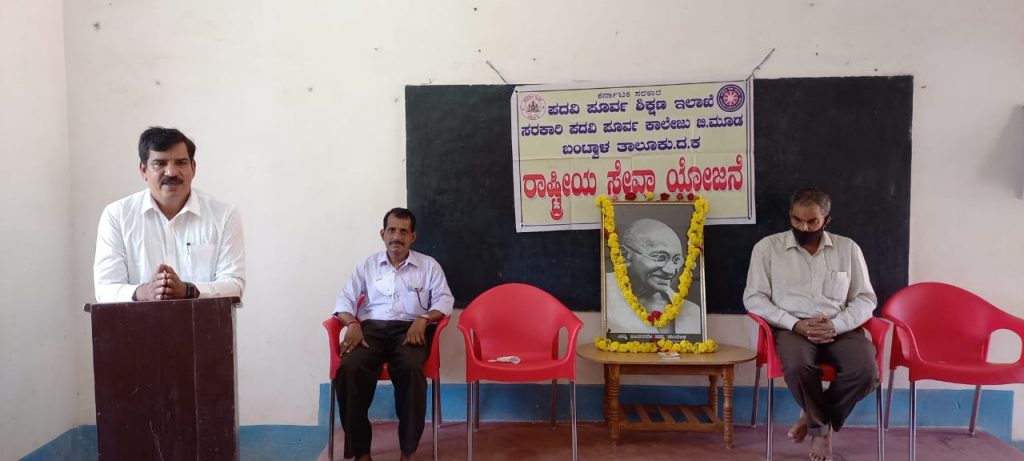 ಬಂಟ್ವಾಳ: ಸರಕಾರಿ ಪದವಿ ಪೂರ್ವ ಕಾಲೇಜು ಬಿ.ಮೂಡ ಇದರ ರಾಷ್ಟ್ರೀಯ ಸೇವಾ ಯೋಜನೆ ಘಟಕದ ವತಿಯಿಂದ ಗಾಂಧೀ ಜಯಂತಿಯನ್ನು ಕಾಲೇಜು ಆವರಣದ ಸ್ವಚ್ಛತಾ ಕಾರ್ಯಗಳೊಂದಿಗೆ ಆಚರಿಸಲಾಯಿತು.ಸಭಾ ಕಾರ್ಯಕ್ರಮದ ಅಧ್ಯಕ್ಷತೆ ವಹಿಸಿದ್ದ ಪ್ರಾಂಶುಪಾಲ ಯೂಸುಫ್ ವಿಟ್ಲ ಅವರು ಗಾಂಧೀಜಿಯವರ ಬೋಧನೆಗಳು ಸಾರ್ವಕಾಲಿಕವಾಗಿ ಅನ್ವಯಿಸಬಹುದಾದ ಆದರ್ಶ ಗಳಾಗಿದ್ದು ಅವರ ಬದುಕಿನ ಹೆಜ್ಜೆಗಳು ದೃಢವಾಗಿರುವುದಕ್ಕೆ ಅವರು ನಡೆದ ಸತ್ಯ ಮಾರ್ಗವೇ ಕಾರಣ ಎಂದು ಹೇಳಿದರು. ಉಪನ್ಯಾಸಕ ಅಬ್ದುಲ್ ರಝಾಕ್ ಅನಂತಾಡಿ ಗಾಂಧೀ ಚಿಂತನೆಗಳನ್ನು ಹಂಚಿಕೊಂಡರು. ಎನ್ಎಸ್ಎಸ್ ಯೋಜನಾಧಿಕಾರಿ, ಉಪನ್ಯಾಸಕ ಬಾಲಕೃಷ್ಣ ನಾಯ್ಕ್ ಕೆ. ಪ್ರಾಸ್ತಾವಿಕ ಮಾತುಗಳೊಂದಿಗೆ ಸ್ವಾಗತಿಸಿದರು. ವಿದ್ಯಾರ್ಥಿನಿ ಸಂಧ್ಯಾ ವಂದಿಸಿದರು.ಉಪನ್ಯಾಸಕ ದಾಮೋದರ ಇ. ಉಪಸ್ಥಿತರಿದ್ದರು. ಸಭಾ ಕಾರ್ಯಕ್ರಮದ ಬಳಿಕ ಎನ್ಎಸ್ಎಸ್ ವಿದ್ಯಾರ್ಥಿಗಳು ಕಾಲೇಜು ರಸ್ತೆಯ ಬದಿ ಹಾಗೂ ಆವರಣದ ಗಿಡಗಂಟೆಗಳನ್ನು ಕಡಿದು ಸ್ವಚ್ಛಗೊಳಿಸಿದರು. ಈ ಸಂದರ್ಭದಲ್ಲಿ ಇತ್ತೀಚೆಗೆ ನಿಧನರಾದ, ಕಾಲೇಜು ಅಭಿವೃದ್ಧಿ ಸಮಿತಿಯ ಮಾಜಿ ಸದಸ್ಯ ಡಿ.ಎಂ.ಕುಲಾಲ್ ಮತ್ತು ಹಾಲಿ ಸದಸ್ಯರಾದ ಫಾರೂಕ್ ಗೂಡಿನಬಳಿ ಅವರಿಗೆ ಶ್ರದ್ಧಾಂಜಲಿ ಸಲ್ಲಿಸಲಾಯಿತು.