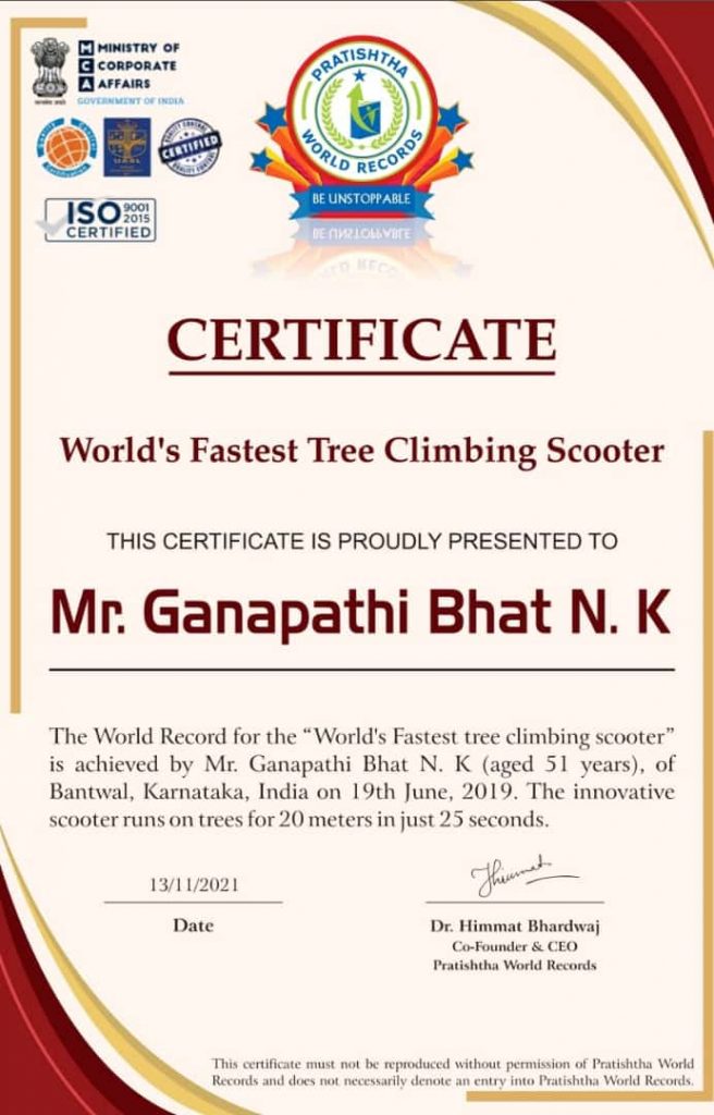 ಬಂಟ್ವಾಳ: ವಿಜಯ ಕರ್ನಾಟಕದ ರಾಜ್ಯಮಟ್ಟದ ಸೂಪರ್ ಸ್ಟಾರ್ ರೈತ ಪುರಸ್ಕಾರ ಪಡೆದ ಬಂಟ್ವಾಳ ತಾಲೂಕಿನ ಸಜಿಪಮೂಡ ಗ್ರಾಮದ ಕೋಮಾಲಿಯ ಪ್ರಗತಿಪರ ಕೃಷಿಕ ಗಣಪತಿ ಭಟ್ ಅವರು ಕೃಷಿ ಕಾರ್ಮಿಕರ ಸಮಸ್ಯೆ ಪರಿಹರಿಸುವ ನಿಟ್ಟಿನಲ್ಲಿ 2019 ರಲ್ಲಿ ಇಂಧನ ಚಾಲಿತ ದೇಶೀಯ ಟ್ರೀ ಬೈಕ್ ಆವಿಷ್ಕರಿಸಿದ್ದರು. ಸುಧಾರಿತ ವಿಧಾನದ ಈ ಬೈಕ್ ಕಡಿಮೆ ಅವಧಿಯಲ್ಲಿ ರೈತರ ಗಮನ ಸೆಳೆದಿರುವುದಲ್ಲದೇ ದೇಶ-ವಿದೇಶಗಳಲ್ಲೂ ಜನಪ್ರಿಯತೆ ಪಡೆದು ಬೇಡಿಕೆ ಸೃಷ್ಟಿಸಿತು. ದಿ ಹಿಸ್ಟರಿ ಚಾನೆಲ್ನಲ್ಲೂ ಪ್ರಕಟಗೊಂಡಿತ್ತು. ಇದೀಗ ಪ್ರತಿಷ್ಠಾ ಎಂಬ ಸಂಸ್ಥೆ ನೀಡುವ ಪ್ರತಿಷ್ಠಾ ವರ್ಲ್ಡ್ ರೆಕಾರ್ಡ್ ಗೌರವಕ್ಕೆ ಗಣಪತಿ ಭಟ್ ಪಾತ್ರರಾಗಿದ್ದಾರೆ.