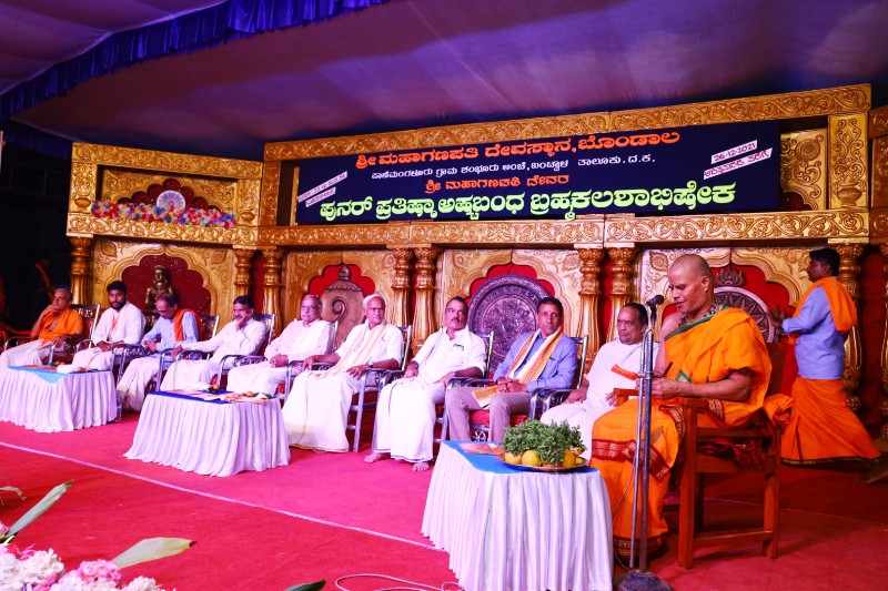 ಬೊಂಡಾಲ ಶ್ರೀ ಮಹಾಗಣಪತಿ ದೇವಸ್ಥಾನದ ಪುನರ್ ಪ್ರತಿಷ್ಠಾ ಅಷ್ಟಬಂದ ಬ್ರಹ್ಮಕಲಶಾಭಿಷೇಕ ಧಾರ್ಮಿಕ ಸಭೆಯಲ್ಲಿ ಆಶೀರ್ವಚನ ನೀಡಿದರು. ಬಿ.ಸಿ.ರೋಡು ಶ್ರೀ ಅನ್ನಪೂರ್ಣೇಶ್ವರೀ ನಾಗದೇವರ ದೇವಸ್ಥಾನದ ಪ್ರಧಾನ ಅರ್ಚಕ ಮಾದಕಟ್ಟೆ ಈಶ್ವರ ಭಟ್, ಉದ್ಯಮಿಗಳಾದ ಜಗನ್ನಾಥ ಚೌಟ ಬದಿಗುಡ್ಡೆ, ಸಚ್ಚಿದಾನಂದ ಶೆಟ್ಟಿ ಬೊಂಡಾಲ, ಪಾಣೆಮಂಗಳೂರು ರೈತರ ಸೇವಾ ಸಹಕಾರಿ ಸಂಘದ ಅಧ್ಯಕ್ಷ ಜಯಶಂಕರ ಬಾಸ್ರಿತ್ತಾಯ, ಶ್ರೀ ಕ್ಷೇತ್ರ ನಿಟಿಲಾಪುರದ ವ್ಯವಸ್ಥಾಪನಾ ಸಮಿತಿ ಅಧ್ಯಕ್ಷ ಎ.ಸುಬ್ರಹ್ಮಣ್ಯ ಭಟ್, ಕಲ್ಲಡ್ಕ ಶ್ರೀ ಉಮಾಶಿವ ಕ್ಷೇತ್ರದ ವ್ಯವಸ್ಥಾಪನಾ ಸಮಿತಿ ಅಧ್ಯಕ್ಷ ಈಶ್ವರ ಭಟ್ ರಾಕೋಡಿ, ಪುರಸಭಾ ಸದಸ್ಯ ಜಯರಾಮ ನಾಯ್ಕ ಗುಂಡೂರು, ಕ್ಷೇತ್ರದ ಆಡಳಿತ ಮೊಕ್ತೇಸರ ಜಯರಾಮ ಹೊಳ್ಳ ನಾಗ್ತಿಮಾರು ಉಪಸ್ಥಿತರಿದ್ದರು.ಸಭೆಯಲ್ಲಿ ಕ್ಷೇತ್ರದ ಶಿಲ್ಪಿಗಳಾದ ಮಣಿ, ಕುಬೇರ, ರಾಮಚಂದ್ರ ಆಚಾರ್ಯ, ತಾಮ್ರದ ಹೊದಿಕೆಯ ಕೆಲಸ ನಿರ್ವಹಿಸಿದ ರವಿ ಶೆಟ್ಟಿ ಹಾಗೂ ಗಾಯಕಿ ಚೈತ್ರಾ ಗಾಣಿಗ ಕಲ್ಲಡ್ಕ ಅವರನ್ನು ಗೌರವಿಸಲಾಯಿತು. ಜೀರ್ಣೋದ್ಧಾರ ಸಮಿತಿಯ ಅಧ್ಯಕ್ಷ ಕೆ.ಪದ್ಮನಾಭ ಕೊಟ್ಟಾರಿ ಸ್ವಾಗತಿಸಿದರು. ಸ್ವಾಗತ ಸಮಿತಿಯ ಬೊಂಡಾಲ ವಿನೋದ್ಕುಮಾರ್ ಶೆಟ್ಟಿ ವಂದಿಸಿದರು. ಯತಿರಾಜ್ ಪೆರಾಜೆ ಹಾಗೂ ರಾಜೇಶ್ ಕೊಟ್ಟಾರಿ ಕಾರ್ಯಕ್ರಮ ನಿರ್ವಹಿಸಿದರು.