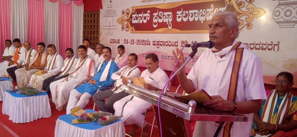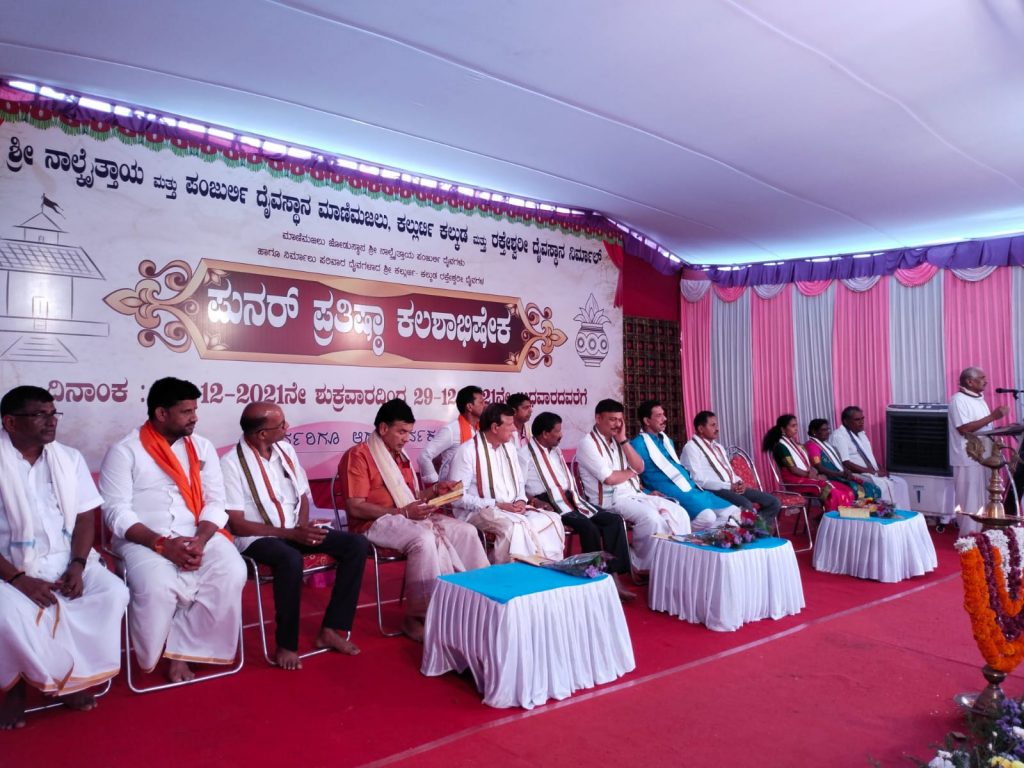ಬಂಟ್ವಾಳ: ಬಂಟ್ವಾಳ ತಾಲೂಕಿನ ನರಿಕೊಂಬು ಗ್ರಾಮದ ಮಾಣಿಮಜಲು ಶ್ರೀ ನಾಲ್ಕೈತ್ತಾಯ ಪಂಜುರ್ಲಿ ದೈವಸ್ಥಾನ ಮತ್ತು ನಿರ್ಮಾಲ್ ಶ್ರೀ ಕಲ್ಲುರ್ಟಿ ಕಲ್ಕುಡ ಹಾಗೂ ರಕ್ತೇಶ್ವರಿ ದೈವಸ್ಥಾನದ ಪುನರ್ ಪ್ರತಿಷ್ಠಾ ಕಲಶಾಭಿಷೇಕ ಕಾರ್ಯಕ್ರಮ ಹಿನ್ನೆಲೆಯಲ್ಲಿ ಮಾಣಿಮಜಲು ಶ್ರೀ ನಾಲ್ಕೈತ್ತಾಯ ಪಂಜುರ್ಲಿ ದೈವಸ್ಥಾನದಲ್ಲಿ ಭಾನುವಾರ ಪುನರ್ ಪ್ರತಿಷ್ಠಾ ಕಲಶಾಭಿಷೇಕ ನಡೆಯಿತು. ಈ ಸಂದರ್ಭ ನಡೆದ ಧಾರ್ಮಿಕ ಸಭೆಯಲ್ಲಿ ಮಾತನಾಡಿದ ದ.ಕ.ಜಿಲ್ಲಾ ಉಸ್ತುವಾರಿ ಸಚಿವ ಎಸ್. ಅಂಗಾರ, ನಮ್ಮ ಪರಂಪರೆಯನ್ನು ಉಳಿಸುವ ಕಾರ್ಯ ಭಕ್ತರ ನೆರವಿನಿಂದ ದೈವಸ್ಥಾನ, ದೇವಸ್ಥಾನಗಳ ಬ್ರಹ್ಮಕಲಶೋತ್ಸವಗಳ ಮೂಲಕ ಆಗುತ್ತಿದೆ ಎಂದರು.