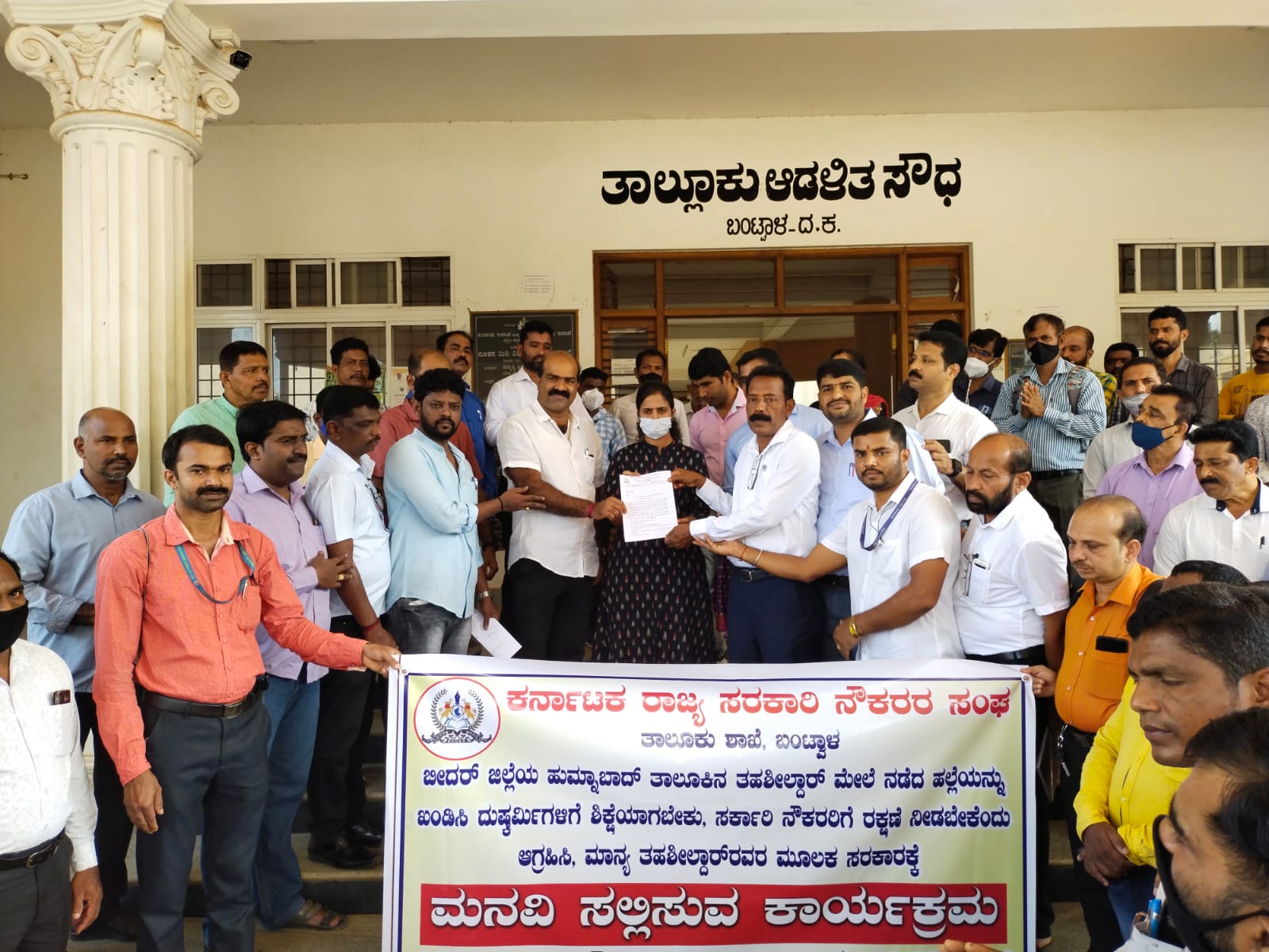 ಬಂಟ್ವಾಳ: ಬೀದರ್ ಜಿಲ್ಲೆಯ ಹುಮನಾಬಾದ್ ತಹಸೀಲ್ದಾರ್ ಡಾ. ಪ್ರದೀಪ್ ಕುಮಾರ್ ಹಿರೇಮಠ್ ಮೇಲೆ ನಡೆದ ಹಲ್ಲೆಯನ್ನು ಖಂಡಿಸಿ ದಾಳಿಕೋರರ ವಿರುದ್ಧ ಕ್ರಮ ಕೈಗೊಳ್ಳಲು ಒತ್ತಾಯಿಸಿ ಮಂಗಳವಾರ ರಾಜ್ಯ ಸರ್ಕಾರಿ ನೌಕರರ ಸಂಘದ ಬಂಟ್ವಾಳ ತಾಲೂಕು ಘಟಕದ ವತಿಯಿಂದ ಬಿ.ಸಿ.ರೋಡಿನ ಆಡಳಿತ ಸೌಧದ ಮುಂಭಾಗ ಪ್ರತಿಭಟನೆ ಮತ್ತು ತಹಸೀಲ್ದಾರ್ ಅವರ ಮೂಲಕ ಮನವಿ ಸಲ್ಲಿಕೆ ಕಾರ್ಯಕ್ರಮ ನಡೆಯಿತು.