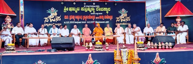ಸಜಿಪನಡು ಶ್ರೀ ಷಣ್ಮುಖ ಸುಬ್ರಹ್ಮಣ್ಯ ದೇವಸ್ಥಾನದ ಬ್ರಹ್ಮಕಲಶೋತ್ಸವ ಹಿನ್ನೆಲೆಯಲ್ಲಿ ಸೋಮವಾರ ಸಂಜೆ ನಡೆದ ಧಾರ್ಮಿಕ ಸಭೆಯಲ್ಲಿ ಅವರು ಆಶೀರ್ವಚನ ನೀಡಿದರು. ನಾವೆಲ್ಲರೂ ಧರ್ಮಕ್ಕೆ ಬದ್ಧರಾಗೋಣ ಎಂದು ಹೇಳಿದ ಸ್ವಾಮೀಜಿ, ಧರ್ಮ ರಕ್ಷಣೆ ಮಾಡಬೇಕು. ಧರ್ಮ ಉಳಿದರೆ ದೇಶ, ಉಳಿದೀತು. ದೇವಸ್ಥಾನ ಸಮಾಜಕ್ಕೆ ಪ್ರೇರಣೆ ನೀಡುತ್ತದೆ. ಬ್ರಹ್ಮಕಲಶೋತ್ಸವ ನಮ್ಮ ಶ್ರದ್ಧೆಯನ್ನು ಹೆಚ್ಚಿಸುತ್ತದೆ ಎಂದರು