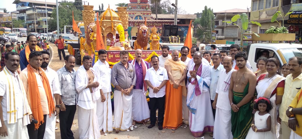ಬಿ.ಸಿ.ರೋಡಿನ ಶ್ರೀ ರಕ್ತೇಶ್ವರೀ ಸನ್ನಿಽಯ ಬಳಿ ಶ್ರೀಧಾಮ ಮಾಣಿಲದ ಶ್ರೀ ಮೋಹನದಾಸ ಪರಮಹಂಸ ಸ್ವಾಮೀಜಿ, ಶ್ರೀ ರಕ್ತೇಶ್ವರೀ ದೇವಸ್ಥಾನದ ಅರ್ಚಕ ಶ್ರೀವತ್ಸ ಭಟ್, ಬಾಚಕೆರೆ ಕ್ಷೇತ್ರದ ಧರ್ಮದರ್ಶಿ ದೇಜಪ್ಪ ಬಾಚಕೆರೆ, ಶ್ರೀ ಅನ್ನಪೂರ್ಣೇಶ್ವರೀ ಕ್ಷೇತ್ರದ ಅಧ್ಯಕ್ಷ ಸೇಸಪ್ಪ ಕೋಟ್ಯಾನ್ ಪಚ್ಚಿನಡ್ಕ, ಶ್ರೀ ರಕ್ತೇಶ್ವರೀ ಕ್ಷೇತ್ರದ ಅಧ್ಯಕ್ಷ ರಾಜೇಶ್ ಎಲ್.ನಾಯಕ್ ಅವರು ತೆಂಗಿನಕಾಯಿ ಒಡೆದು ಮೆರವಣಿಗೆಗೆ ಚಾಲನೆ ನೀಡಿದರು.