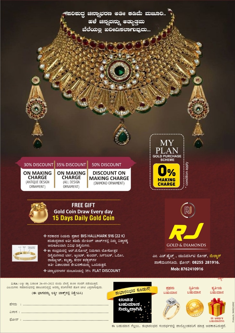 ಬಂಟ್ವಾಳ ತಾಲೂಕಿನ ಪಾಣೆಮಂಗಳೂರು ಸಮೀಪದ ಮೆಲ್ಕಾರ್ ವಿವಿ ರಸ್ತೆಯ ಎಂ.ಎಚ್. ಹೈಟ್ಸ್ ಸಂಕೀರ್ಣದಲ್ಲಿ ಕಾರ್ಯಾಚರಿಸುತ್ತಿದ್ದ ಆರ್.ಜೆ. ಗೋಲ್ಡ್ ಚಿನ್ನಾಭರಣ ಮಳಿಗೆ ಈಗ ವಿಸ್ತೃತಗೊಂಡು ಶುಭಾರಂಭಗೊಳ್ಳುವ ಹಿನ್ನೆಲೆಯಲ್ಲಿ ಲಕ್ಕಿ ಡ್ರಾ ಇರಲಿದೆ.