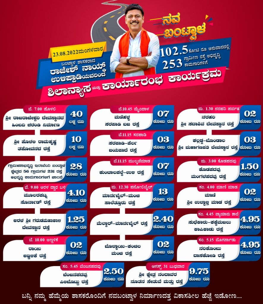 ಬಂಟ್ವಾಳ ಶಾಸಕ ರಾಜೇಶ್ ನಾಯ್ಕ್ ಉಳಿಪ್ಪಾಡಿ ಅವರು ಬಂಟ್ವಾಳ ಕ್ಷೇತ್ರದಲ್ಲಿ ಗ್ರಾಮೀಣ ಇಲಾಖೆ ಮತ್ತು ಲೋಕೋಪಯೋಗಿ ಇಲಾಖೆಯ 102.5 ಕೋಟಿ ರೂ.ವೆಚ್ಚದಲ್ಲಿ ಬಂಟ್ವಾಳ ಕ್ಷೇತ್ರದ 56 ಗ್ರಾಮಗಳ 253 ಗ್ರಾಮೀಣ ರಸ್ತೆ ಅಭಿವೃದ್ಧಿ ಕಾಮಗಾರಿಗಳಿಗೆ ಮಂಗಳವಾರ ವಿವಿಧ ಗ್ರಾಮಗಳಲ್ಲಿ ಶಿಲಾನ್ಯಾಸ ನೆರವೇರಿಸಿದರು.