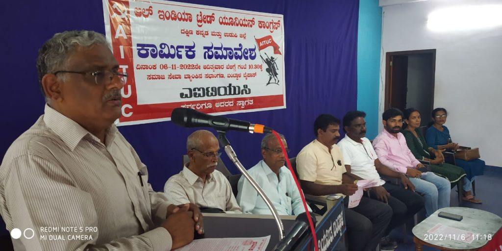 ಎಐಟಿಯುಸಿ ಜಿಲ್ಲಾ ಪ್ರಧಾನ ಕಾರ್ಯದರ್ಶಿ ವಿ.ಎಸ್.ಬೇರಿಂಜ ಸ್ವಾಗತಿಸಿದರು. ಎಐಟಿಯುಸಿ ಜಿಲ್ಲಾ ಸಹಕಾರ್ಯದರ್ಶಿ ಎಂ.ಕರುಣಾಕರ ವಂದಿಸಿದರು.