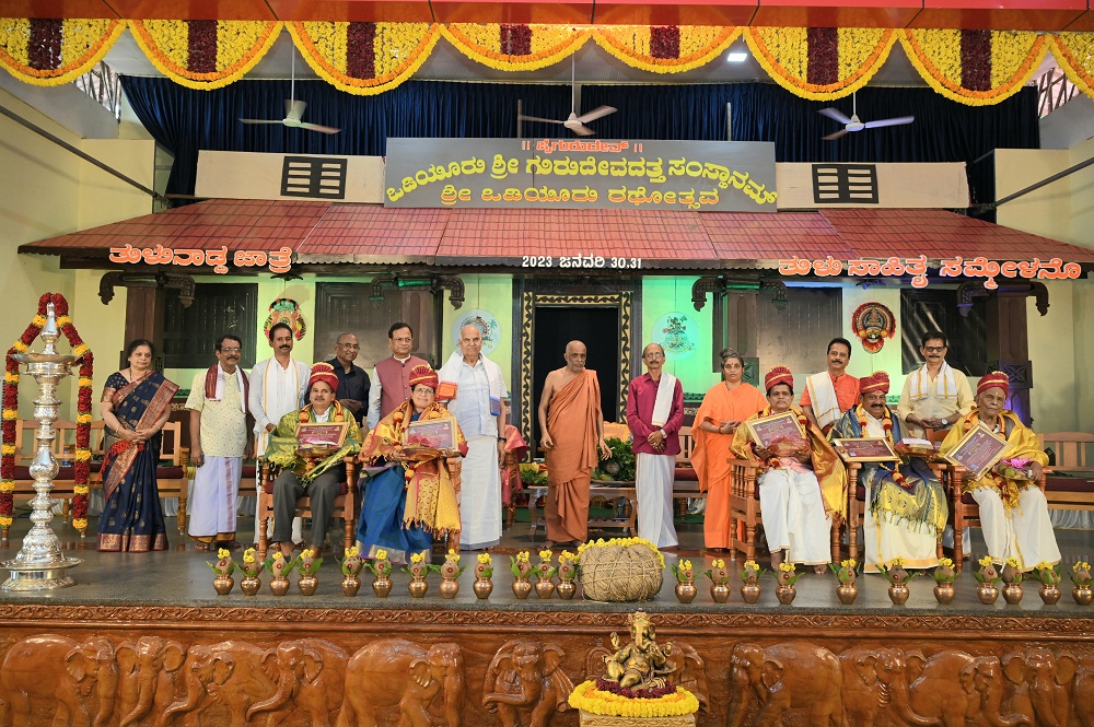 ಒಡಿಯೂರಿನಲ್ಲಿ ನಡೆದ ತುಳುನಾಡ ಜಾತ್ರೆ-ಶ್ರೀ ಒಡಿಯೂರು ರಥೋತ್ಸವ ಹಿನ್ನೆಲೆಯಲ್ಲಿ ನಡೆದ ತುಳು ಸಾಹಿತ್ಯ ಸಮ್ಮೇಳನದಲ್ಲಿ ಮಂಗಳವಾರ ಐವರು ಸಾಧಕರಿಗೆ ತುಳು ಸಿರಿ ಮಾನಾದಿಗೆ (ಸನ್ಮಾನ) ಗೌರವಾರ್ಪಣೆ ಮಾಡಲಾಯಿತು. ಶ್ರೀ ಗುರುದೇವಾನಂದ ಸ್ವಾಮೀಜಿ, ಸಾಧ್ವಿ ಶ್ರೀ ಮಾತಾನಂದಮಯೀ, ಹಿರಿಯ ಸಾಹಿತಿ ಸಮ್ಮೇಳನಾಧ್ಯಕ್ಷ ಡಾ. ವಸಂತ ಕುಮಾರ ಪೆರ್ಲ, ಉದ್ಯಮಿಗಳಾದ ಸದಾಶಿವ ಶೆಟ್ಟಿ ಕುಳೂರು, ವಾಮಯ್ಯ ಬಿ.ಶೆಟ್ಟಿ, ದಯಾನಂದ ಹೆಗ್ಡೆ, ಒಡಿಯೂರು ಸೌಹಾರ್ದ ಸಹಕಾರಿ ಅಧ್ಯಕ್ಷ ಸುರೇಶ್ ರೈ ಹಾಗೂ ಸಂಜೀವಿನಿ ಆಸ್ಪತ್ರೆ ಮುಂಬೈನ ಆಡಳಿತ ನಿರ್ದೇಶಕ ಡಾ. ಸುರೇಶ್ ರಾವ್ ಸಹಿತ ಗಣ್ಯರ ಸಮಕ್ಷಮ ಹಿರಿಯ ಮೃದಂಗವಾದಕ ಶತಾಯುಷಿ ವಿದ್ವಾನ್ ಬಾಬು ರೈ, ಸಾಹಿತಿ ಸಂಶೋಧಕಿ ಡಾ. ಸಾಯಿಗೀತಾ ತೋಕೂರುಗುತ್ತು, ಸಹಕಾರಿ ಎಸ್.ಬಿ.ಜಯರಾಮ ರೈ, ತುಳು ವಸ್ತು ಸಂಗ್ರಾಹಕ ಸುಧಾಕರ ಶೆಟ್ಟಿ ಹಿರ್ಗಾನ, ಸಾವಯವ ಕೃಷಿಕ ರಾಮಣ್ಣ ಗೌಡ ಅವರನ್ನು ಗೌರವಿಸಲಾಯಿತು. ಯಶವಂತ ವಿಟ್ಲ ಕಾರ್ಯಕ್ರಮ ನಿರ್ವಹಿಸಿದರು. PHOTO COURTESY: click point modeling studio, Kanyana,